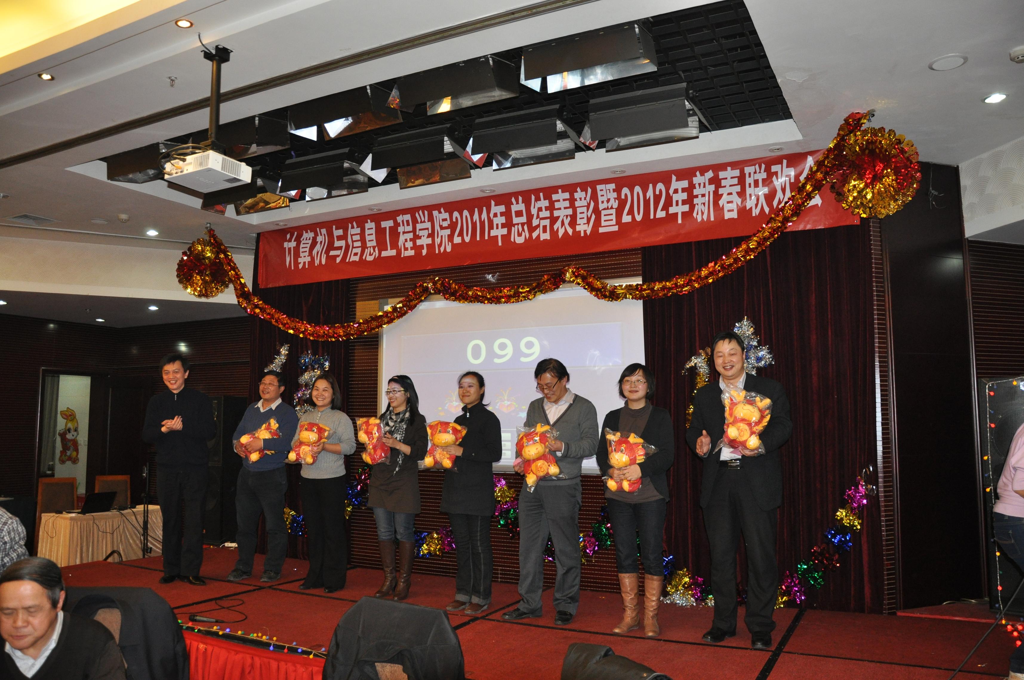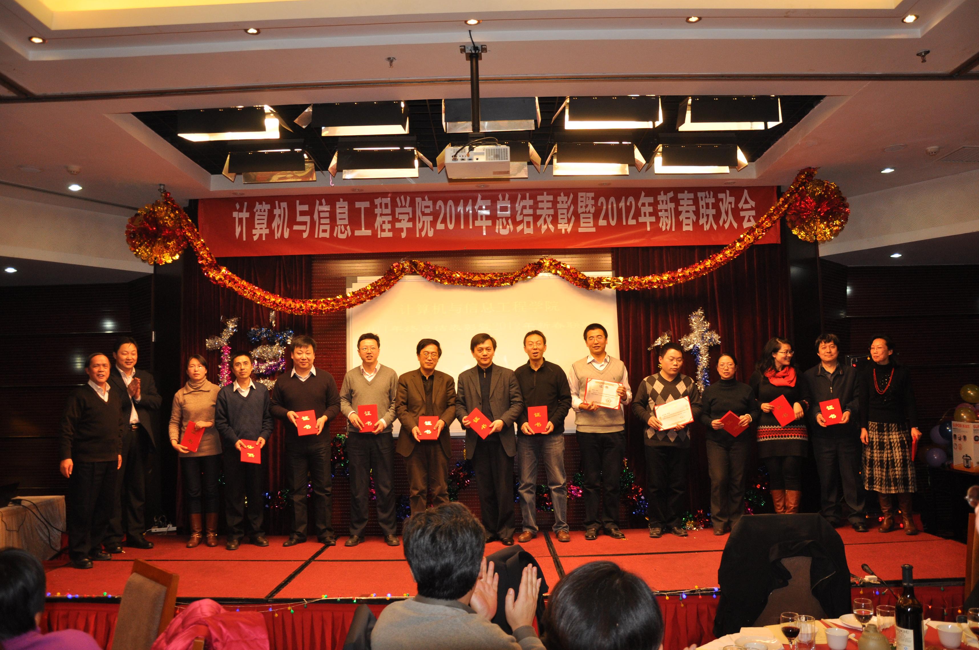 全體教師首先觀看了賀歲DV短片,短片回顧了2011年計信學院全體教職工積極努力、團結(jié)一心取得的各項驕人佳績。劉載文院長代表學院發(fā)表了熱情洋溢的講話,他簡單回顧了學院在2011年的成績與收獲,向大家過去一年來的辛勤工作表示感謝,并勉勵大家在新的一年里百尺竿頭,再創(chuàng)佳績。陳誼書記宣讀表彰決定,會議對2011年成績顯著的先進個人和先進集體進行了表彰。此次表彰共設(shè)八個獎項:教學成果獎、科研工作先進個人、學科專業(yè)貢獻獎、黨務工作先進個人、學科競賽優(yōu)秀指導教師、優(yōu)秀班主任、實驗室先進工作者、分工會活動積極分子。共計56名老師和2個系獲得了以上獎項。