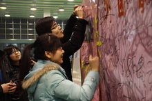 舞會中最令同學們興奮的就是零點倒計時了。很多同學表示,今年是他們過得最特殊的一次元旦。此次舞會上還有一大亮點:祝福墻。同學們在工作人員的指引下,在便利貼上寫了自己的新年寄語,并親自貼到祝福墻上。記者發現,祝福墻上不僅有同學們的心愿,還有老師們的祝福。