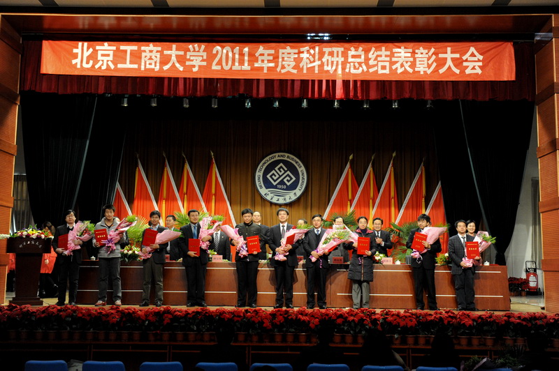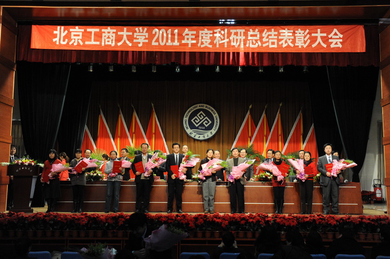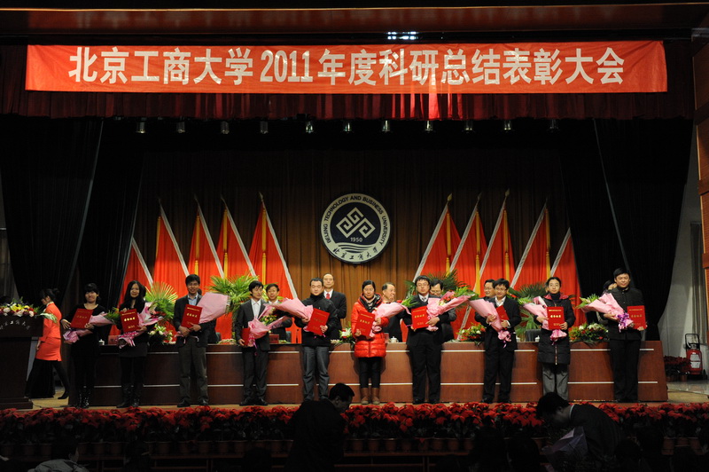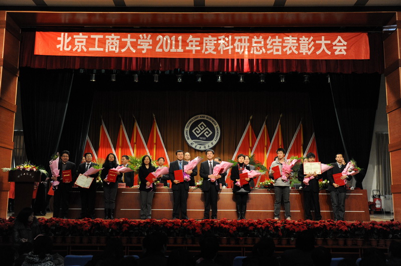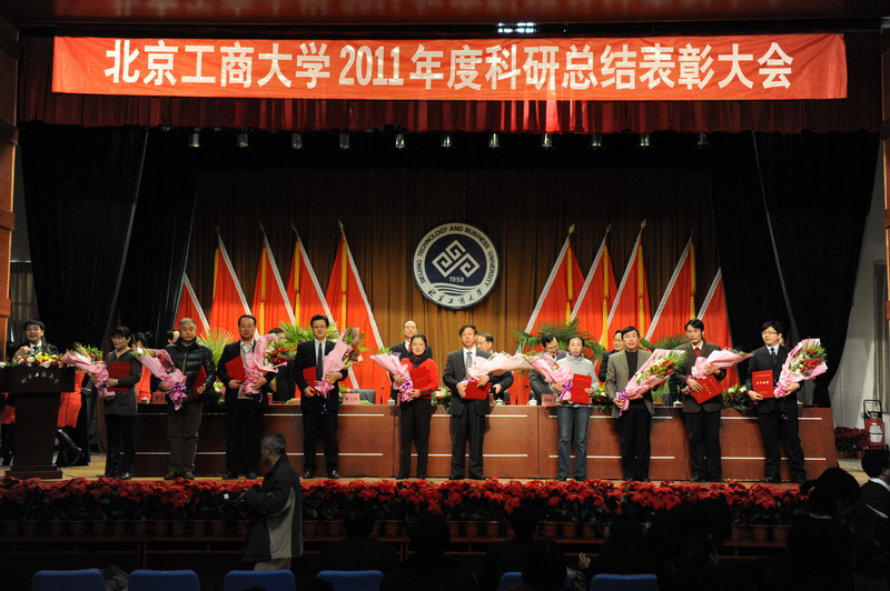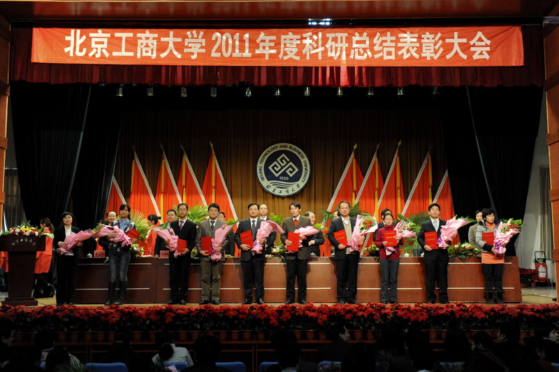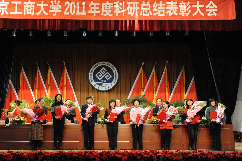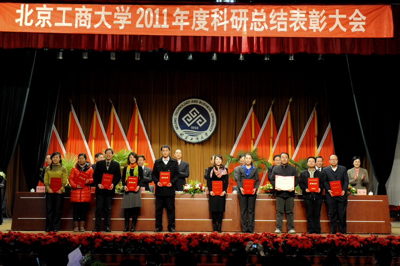 孫寶國副校長宣讀了省部級獎勵、國家級項目立項、省部級項目立項和北京工商大學2011年科學研究優秀成果獎名單獲獎單位及人員名單,李朝鮮副校長宣讀了個人科研排名前10名、科研單位完成工作量總分排名前3名、科研管理先進單位、科研管理先進個人、科協工作先進個人的名單(名單另發)。校領導為獲獎單位代表和個人頒發了榮譽證書和獎牌。