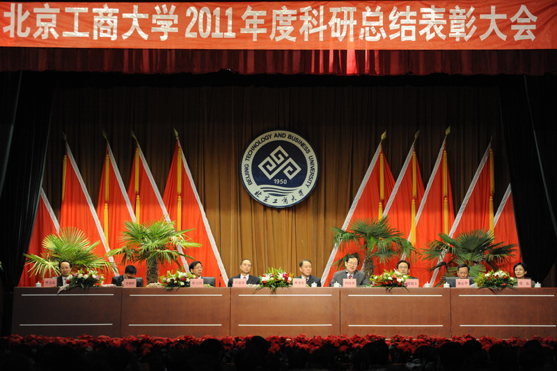 1月11日下午,阜成路校區禮堂內鮮花簇擁,氣氛熱烈,北京工商大學2011科研工作總結表彰大會在此隆重召開。黨委書記孫堯東、校長譚向勇、黨委副書記盧思鋒、黨委副書記、紀委書記張德玉、副校長孫寶國、謝志華、李朝鮮、張耘、呼文亮出席大會。全體中層干部、教師及學生代表參加了會議。會議由科學技術處處長王國順主持。