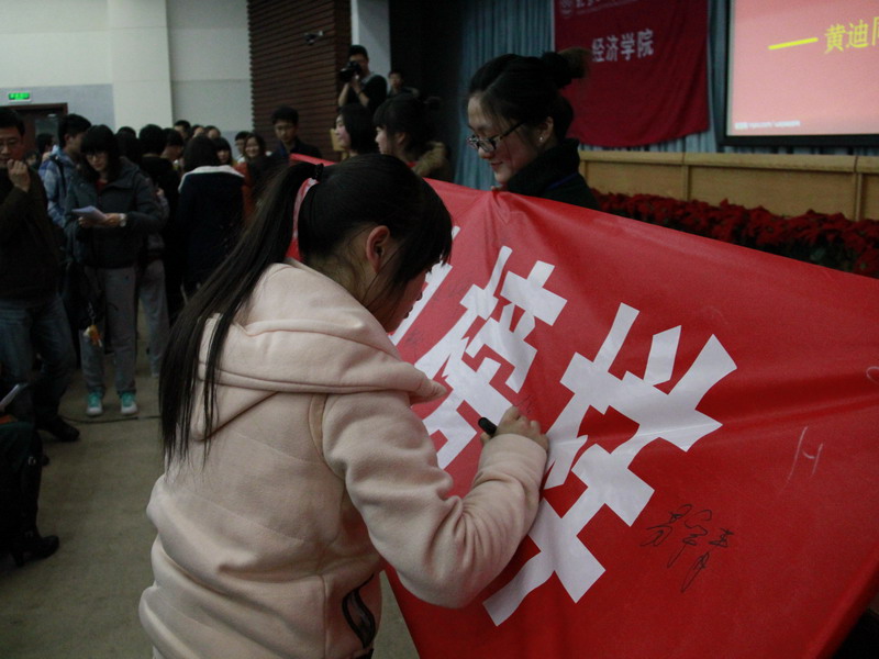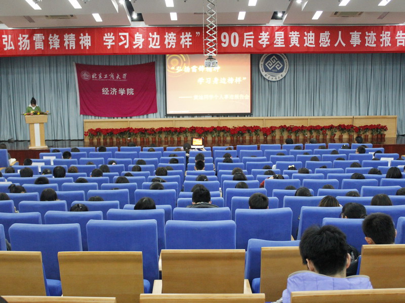 3月7日晚,由經濟學院主辦的“弘揚雷鋒精神,學習身邊榜樣”——黃迪同學個人事跡報告會在良鄉(xiāng)校區(qū)舉行。校團委書記呂良、經濟學院黨總支副書記馬韜光、全體輔導員以及全院學生參加了本次報告會,學院團總支書記王海偉主持會議。