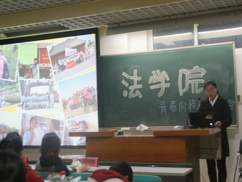 在主持人的介紹下,法學院5名“青春榜樣”依次登臺。法學091班的劉偉向同學們講述了自己邊讀書邊侍奉生病母親和打工養家的經歷。法學091班顧喜艷同學講述了自己面對家中突如其來的變故如何承擔責任。不僅如此,她還盡自己所能利用自己打工掙來的錢資助了一名小學生。她的樸實感染了在場同學,同學和老師們潸然淚下,給予了顧喜艷熱烈的掌聲。2011年國家獎學金獲得者093班的高揚著重介紹了個人的職業生涯規劃和奮斗經歷,講述自己如何堅定信念,不斷努力,自強不息,實現自己心中的目標。全部以英文方式展示的PPT,流利的演講中時不時地夾雜著富有磁性的英語口語,把整個報告會到推向了高潮。2011級的臧元田則是用幽默的方式講述了自己如何幫助同學的故事,從身邊的小事學習雷鋒。101班的趙慧芳和在場同學分享了自己充實的大學時光,她是篤志好學的榜樣,她說:“我是個閑不住的人,學習之余我會經常參加各種活動,通過活動我真的收獲很多”。