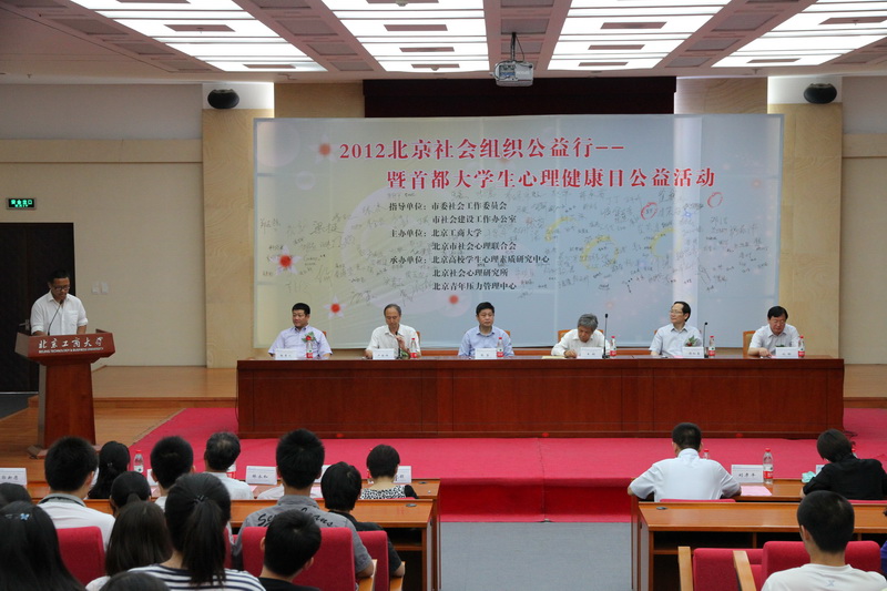 今年,在首都第十三個“5.25”大學生心理健康日到來之際,市委副秘書長王翔、市委社會工委副書記,市社會辦副主任張堅、市委社會工委委員,市社會辦副主任劉軒、市社會辦副巡視員張青之等領導蒞臨我校,在校長譚向勇和黨委副書記盧思鋒的陪同下,來到大學生中間,參加由我校和北京市社會心理聯合會主辦的“2012北京社會組織公益行暨首都大學生心理健康日公益活動”。活動啟動儀式由學校黨委副書記盧思鋒主持。