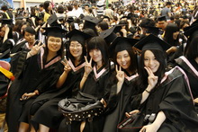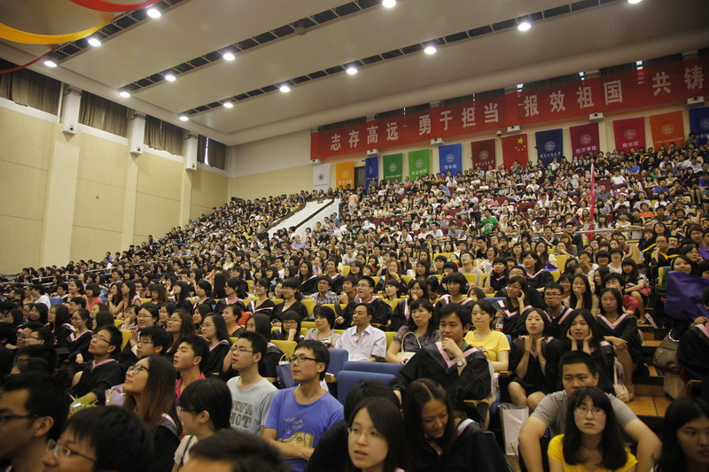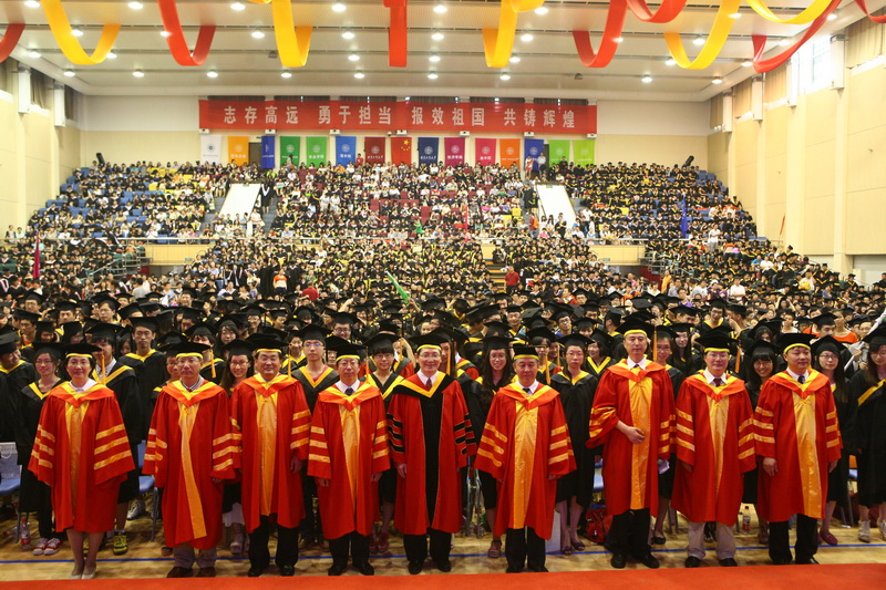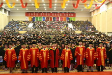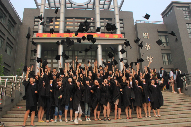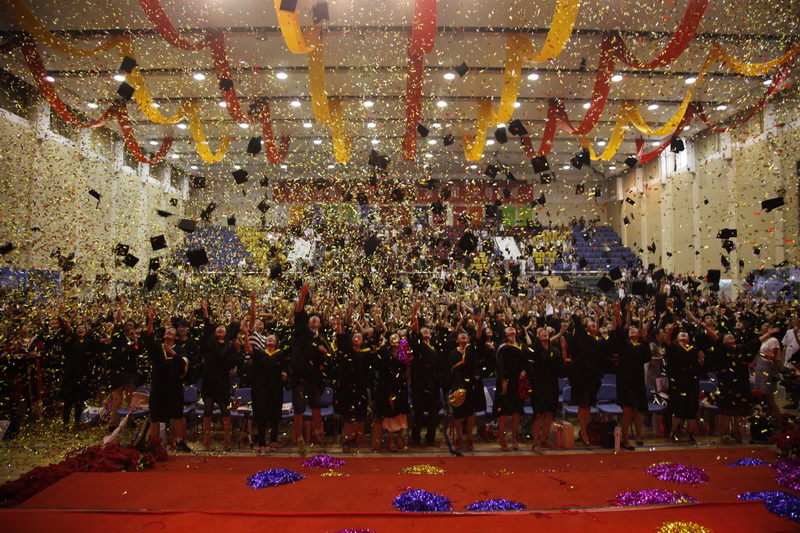 身穿學士服的畢業生一起將手中的學士帽高高拋向空中,從此,他們和自己的大學時代揮手告別,用微笑與汗水迎接明天。