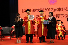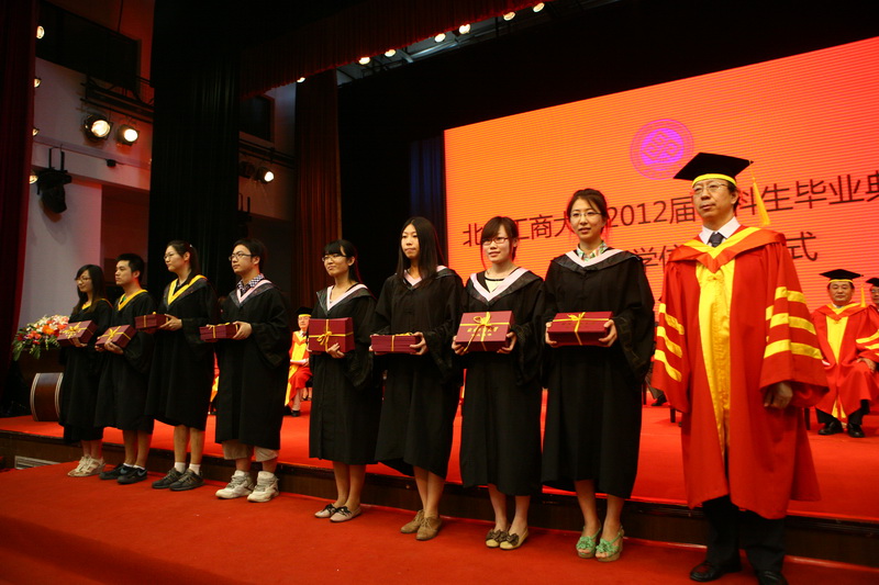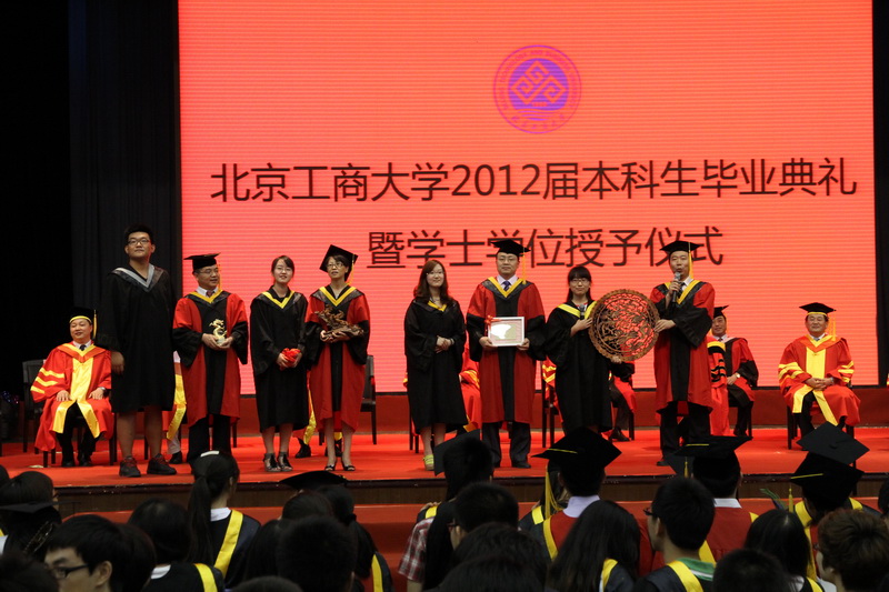 李朝鮮副校長宣讀了《北京工商大學關于2012屆本科生畢業暨學士學位授予的決定》,2680名本科畢業生獲得學士學位。孫寶國副校長為畢業生代表頒發了畢業證書。隨后張德玉副書記宣讀了《關于表彰2012屆優秀畢業生的決定》,288人榮獲北京工商大學優秀畢業生稱號,144人榮獲北京市優秀畢業生稱號。黨委書記孫堯東為優秀畢業生代表頒發了榮譽證書。