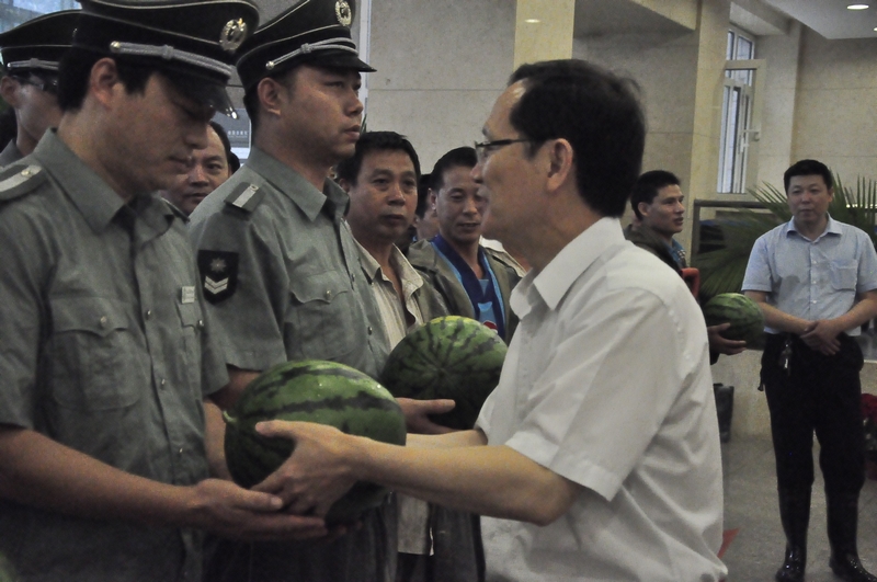 譚向勇校長代表學校黨政對保衛處、后勤管理處、規劃建設處及物業公司的同志們犧牲個人休息時間、堅守崗位辛勤工作表示慰問,對大家及時做好防汛工作表示由衷感謝并贈送了慰問品。譚校長表示,今年暑期北京雨水比較多,對北京的城市建設和應急系統是個考驗,學校有關部門和維修人員、物業人員、保安人員、在建施工人員等及時采取措施進行應對,排除險情,保證了校園的正常運轉,希望大家繼續努力,做好暑期的各項工作。