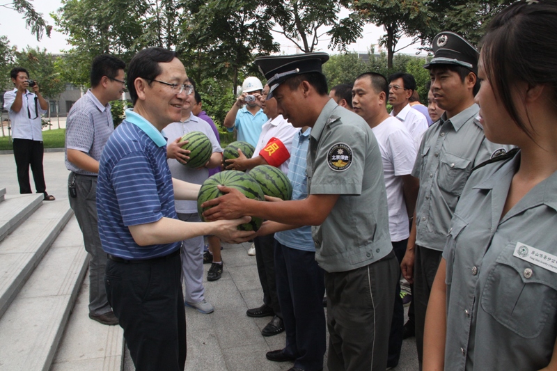 譚向勇校長代表學(xué)校黨政對(duì)后勤管理處、規(guī)劃建設(shè)處、保衛(wèi)處及物業(yè)公司的同志們堅(jiān)守崗位表示慰問,對(duì)大家辛勤工作表示感謝并贈(zèng)送了慰問品。譚校長表示,今年暑期北京雨水比較多,學(xué)校的防汛工作應(yīng)對(duì)有效,學(xué)校的基礎(chǔ)建設(shè)和生活區(qū)回購后的各項(xiàng)工作正在緊鑼密鼓的進(jìn)行,他感謝大家在高溫天氣仍堅(jiān)守崗位認(rèn)真工作,保障假期校園水電、餐飲、學(xué)生管理、物業(yè)管理、維修、綠化等各項(xiàng)工作的正常運(yùn)行和校園的安全穩(wěn)定,希望大家繼續(xù)努力,加強(qiáng)工作,為新學(xué)期開學(xué)做好各項(xiàng)準(zhǔn)備和保障。