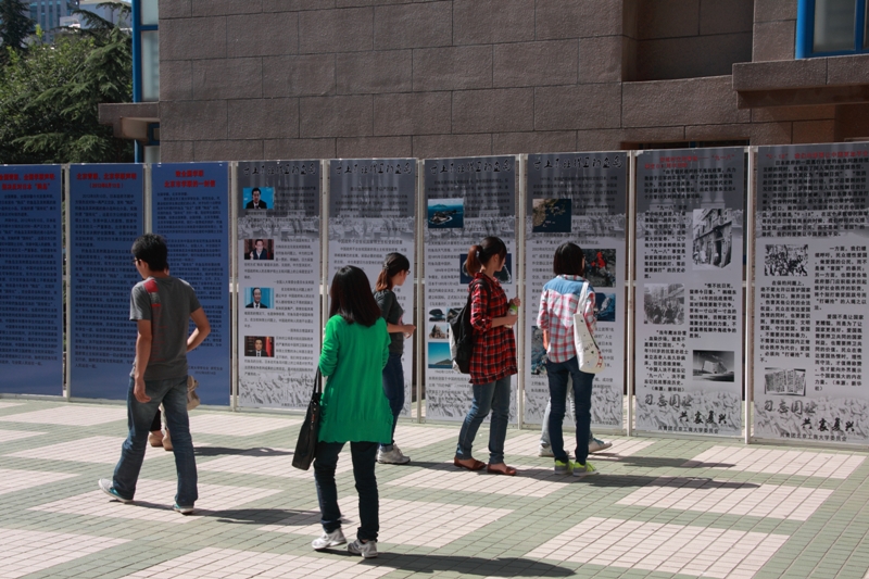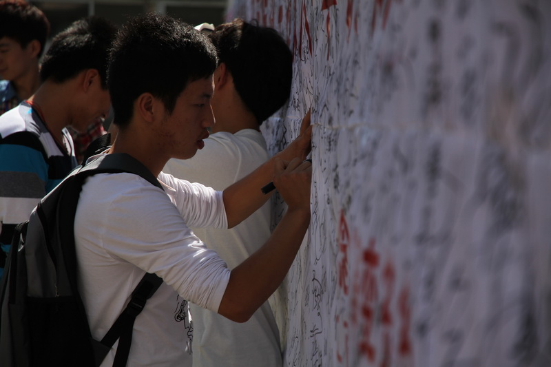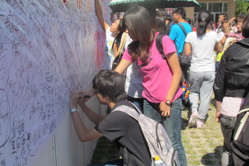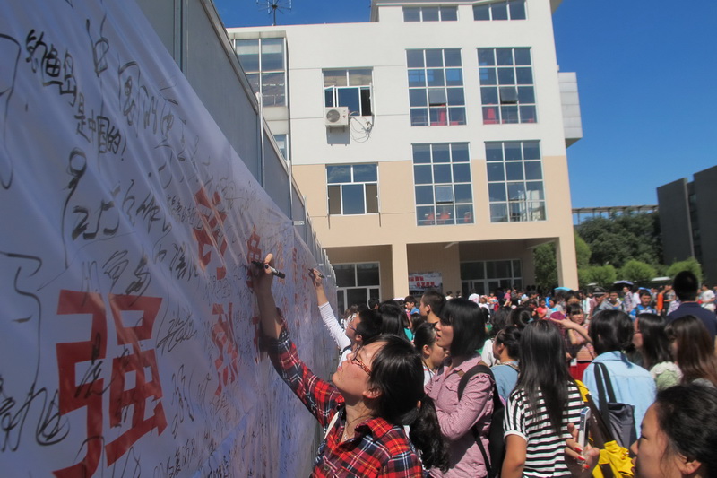 在阜成路校區和良鄉校區的簽名現場,一側陳列著我國政府和各社會團體關于釣魚島問題的聲明、九·一八事變和釣魚島是中國固有領土的史實資料展板,一側懸掛著白色布幔橫幅:“勿忘國恥,捍衛主權,振興中華,從我做起”、“釣魚島是中國固有領土,強烈抗議日本政府非法購島!”學生們紛紛在橫幅上表達自己的心聲以及簽上自己的名字: “釣魚島是中國的,捍衛中國領土完整”、“釣魚島是中國固有領土”、“還我釣魚島”等留言強烈地表達了大家的愛國之情以及對日本的極右翼勢力的憤懣之情。