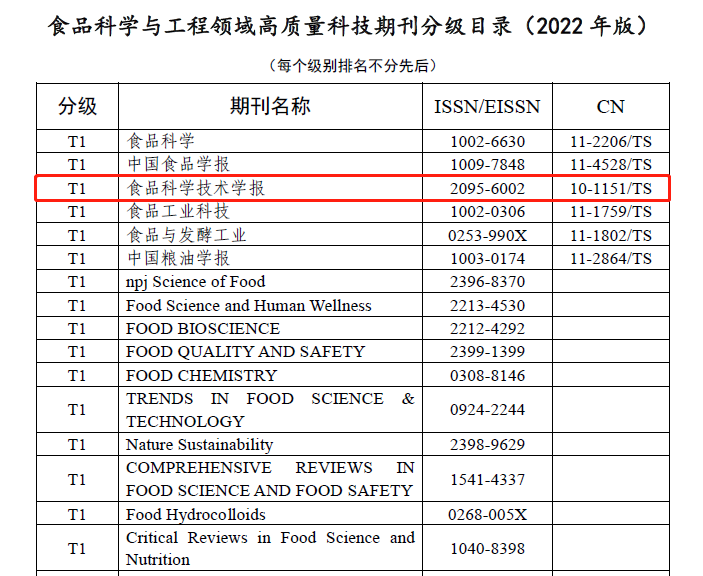 近日,由中國科協(xié)統(tǒng)一部署,我國首次面向全球食品科技期刊開展分級認定的《食品科學與工程領域高質量科技期刊分級目錄》(以下簡稱《分級目錄》),在中國食品科學技術學會官網正式發(fā)布,其中由我校主辦的《食品科學技術學報》入選《分級目錄》第一方陣,即T1類。