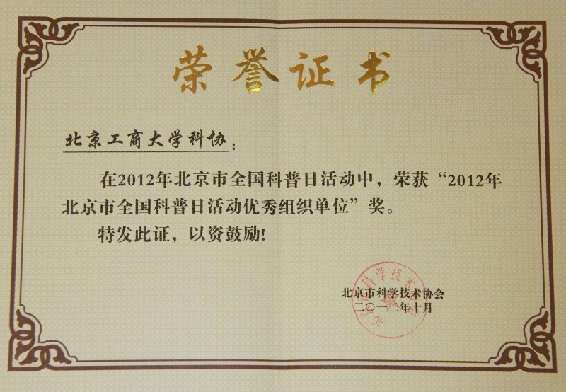 11月1日,2012年北京市全國科普日活動總結表彰大會在北京科技活動中心召開。城區科協、郊區科協、企業科協、高校科協的工作人員參加了會議。我??茀f獲得“2012年北京市全國科普日活動優秀組織單位”。