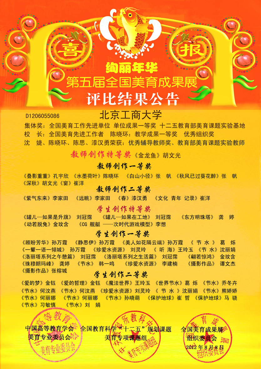 我校榮獲全國美育工作先進單位、單位成果一等獎、“十二五”教育部美育課題實驗基地三項集體獎;藝傳學院教師沈婕、陳曉環、陳思、漆漢勇榮獲優秀輔導教師獎、教育部美育課題實驗教師稱號;胡文光、孔宇欣、陳曉環、張帆、崔洋、李家田、漆漢勇分別榮獲教師創作特等獎、一等獎和二等獎;學生獲創作特等獎、一等獎和二等獎共38項。
