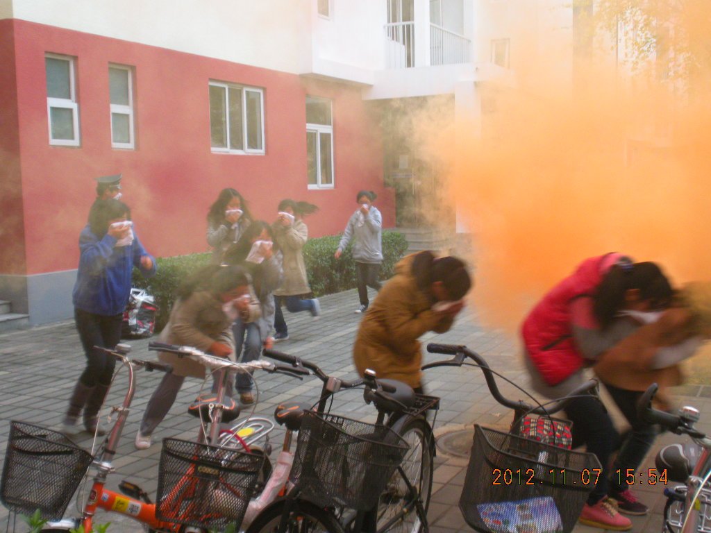 16:00,消防演習正式開始。此時警報長鳴,煙霧滾滾,來自各學院的近600名大一新生以毛巾掩面,有秩序地從煙霧中穿過,匯集到龍月廣場前有序集合,進行人數清點。現場形象逼真,忙碌而不慌亂。