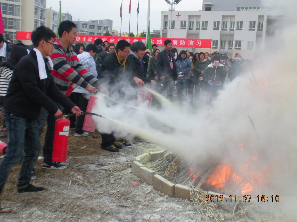 隨后,參演學生在生活區南部空地進行了實際滅火演練。在保衛處副處長楊東杰的示范下,參演學生熱情高漲,嚴肅認真,學習實踐了滅火器的實際操作,取得了良好的效果,達到了預期的目的。