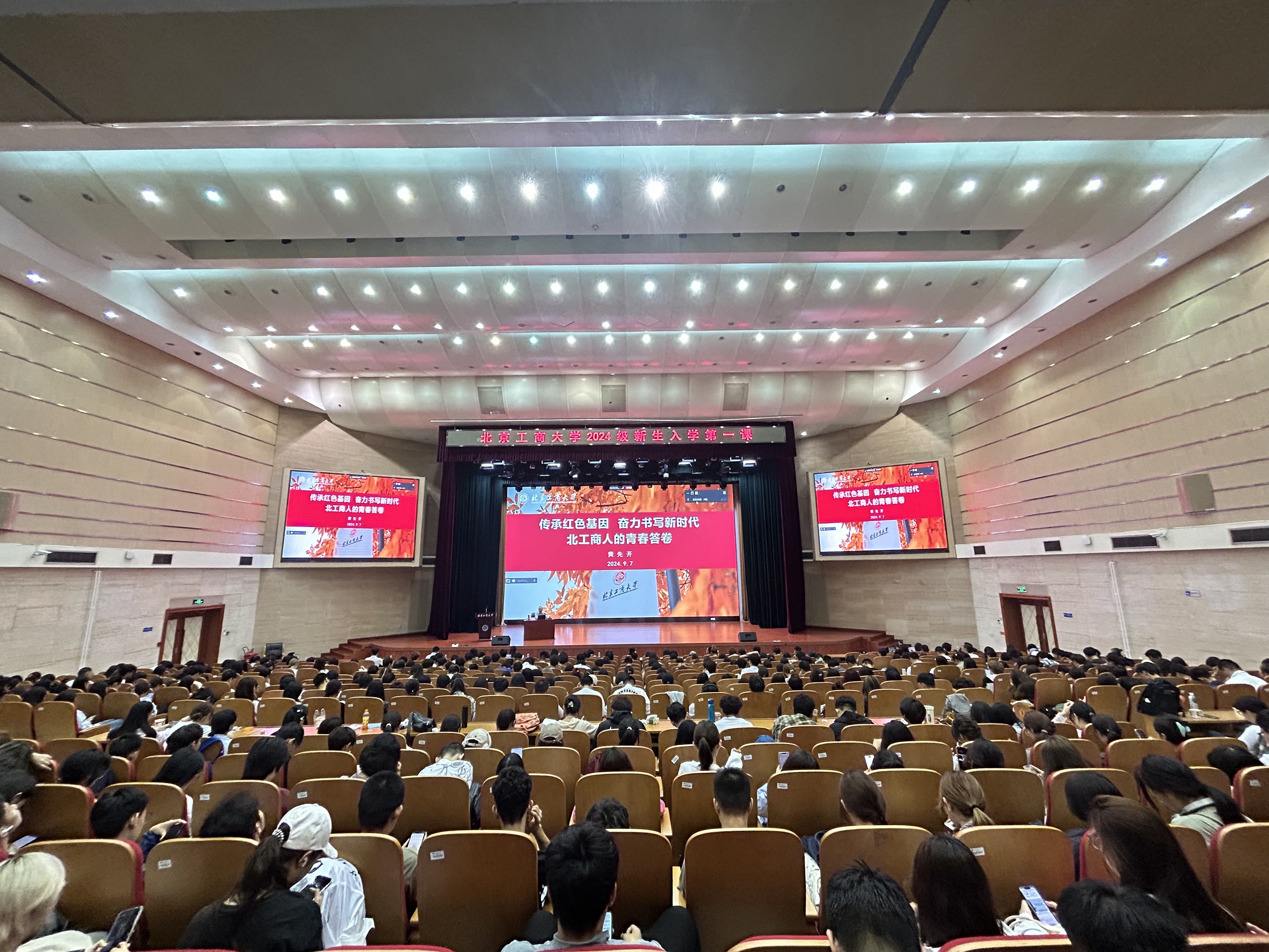 學校黨委書記黃先開以“傳承紅色基因,奮力書寫新時代,北工商人的青春答卷”為題為全體2024級新生講授“開學第一課”。