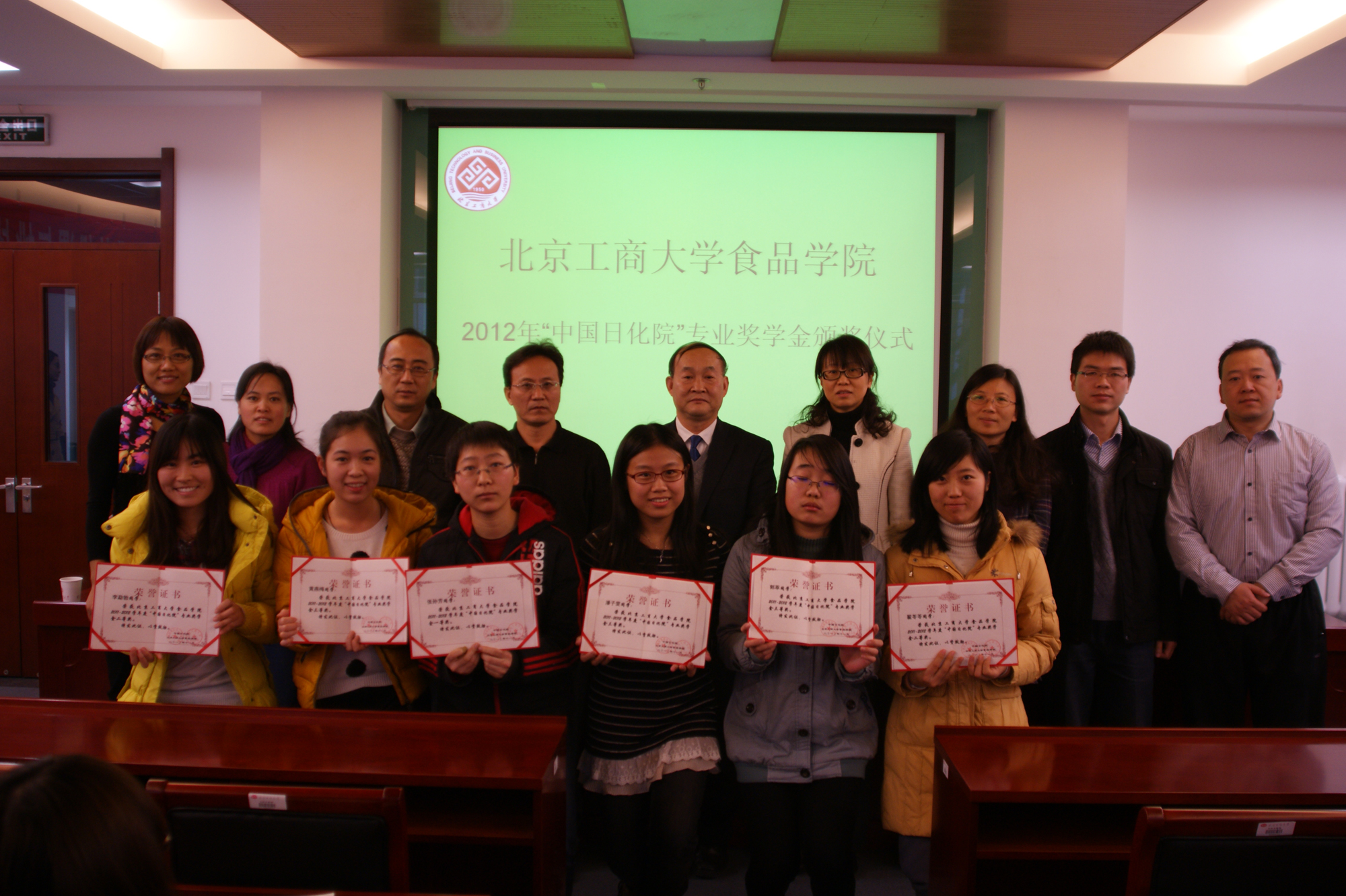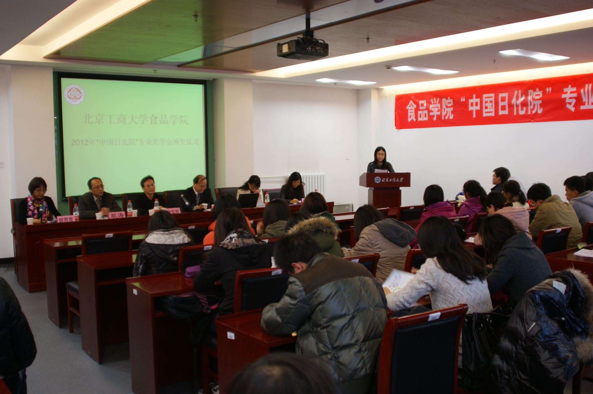 12月7日,食品學(xué)院2012年“中國(guó)日化院”專業(yè)獎(jiǎng)學(xué)金頒獎(jiǎng)儀式在阜成路校區(qū)綜合樓舉行。中國(guó)日用化學(xué)工業(yè)研究院院長(zhǎng)王萬(wàn)緒教授、中國(guó)日用化學(xué)工業(yè)研究院工程管理中心主任耿濤教授、食品學(xué)院院長(zhǎng)徐寶財(cái)教授、應(yīng)用化學(xué)系系主任田紅玉教授、黨總支書(shū)記何猛出席頒獎(jiǎng)儀式。頒獎(jiǎng)儀式由食品學(xué)院黨總支副書(shū)記胡燕霞主持。