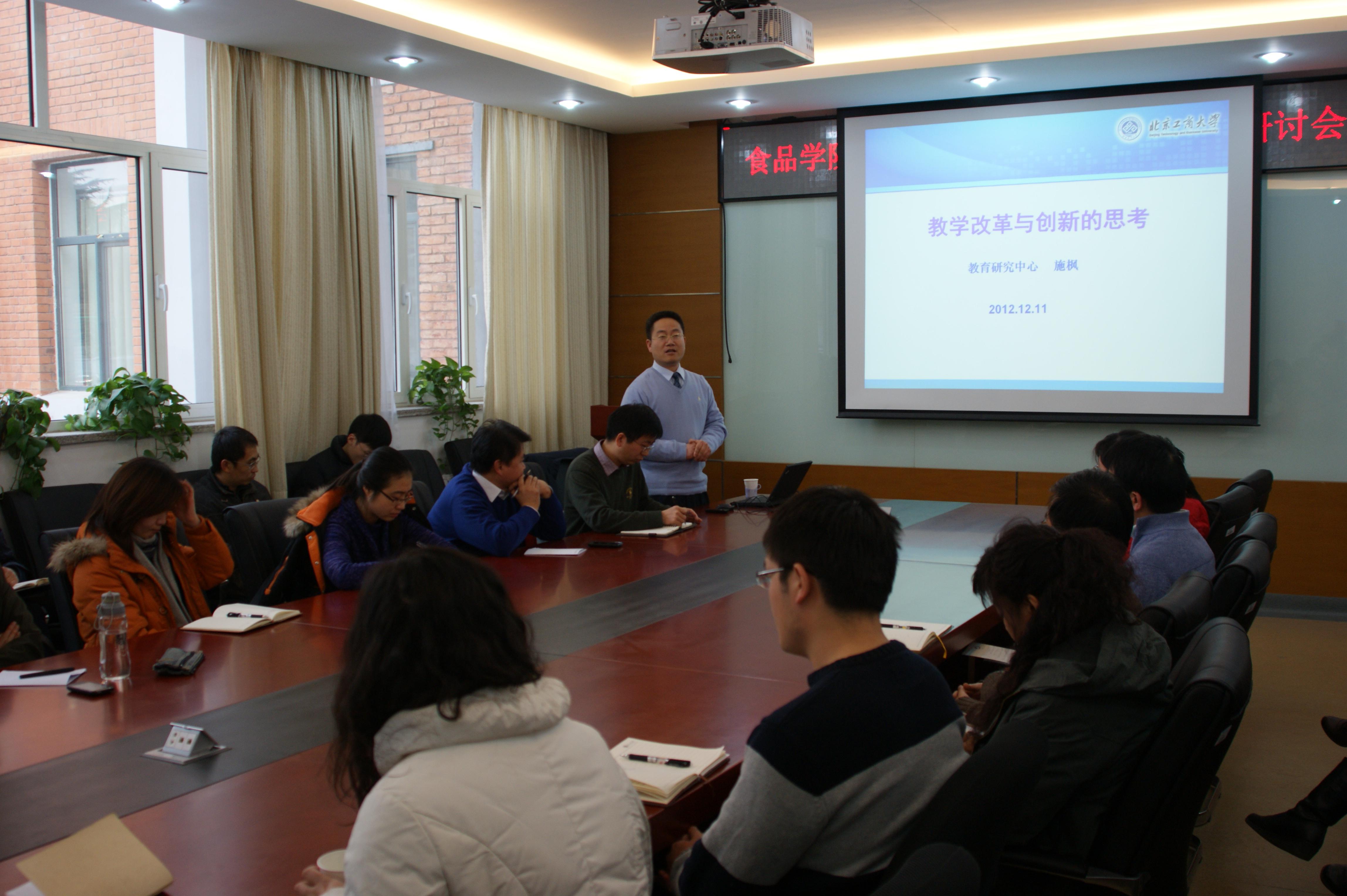 教育研究中心主任施楓做了主題為“教學改革與創新的思考”的報告,分別從中國崛起的新挑戰、高等教育的國際比較、中國高等教育存在的問題及改革方向、北京工商大學綜合改革的思考、食品學院的競爭優勢等5個方面進行了深入的闡述和分析。