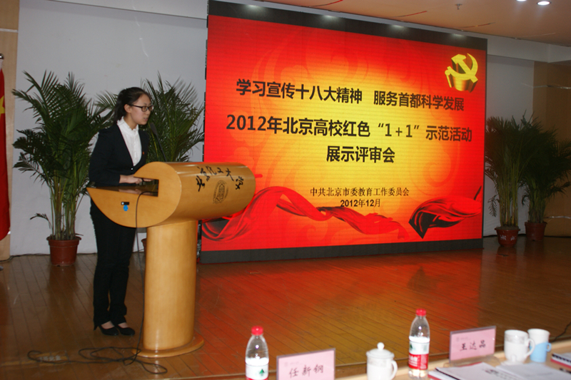 此次紅色“1+1”示范活動展示評審會由北京市教育工委主辦,以“學(xué)習(xí)宣傳十八大精神,服務(wù)首都科學(xué)發(fā)展”為主題。北京市委教育工委副書記唐立軍、市委組織部、市委宣傳部、市委教育工委、市委農(nóng)村工委、市委社會工委、首都文明辦等職能部門領(lǐng)導(dǎo)出席評審會,高校主管部門負(fù)責(zé)人、學(xué)生黨支部代表、媒體代表共200多人參加。
