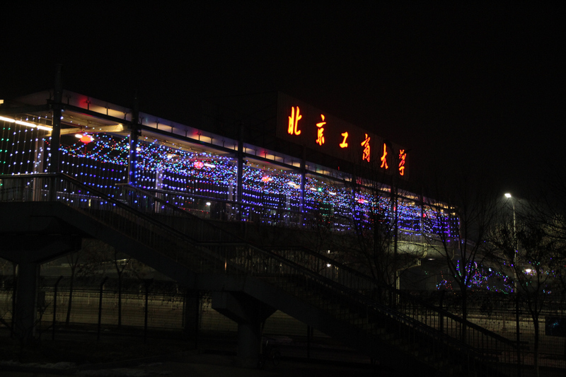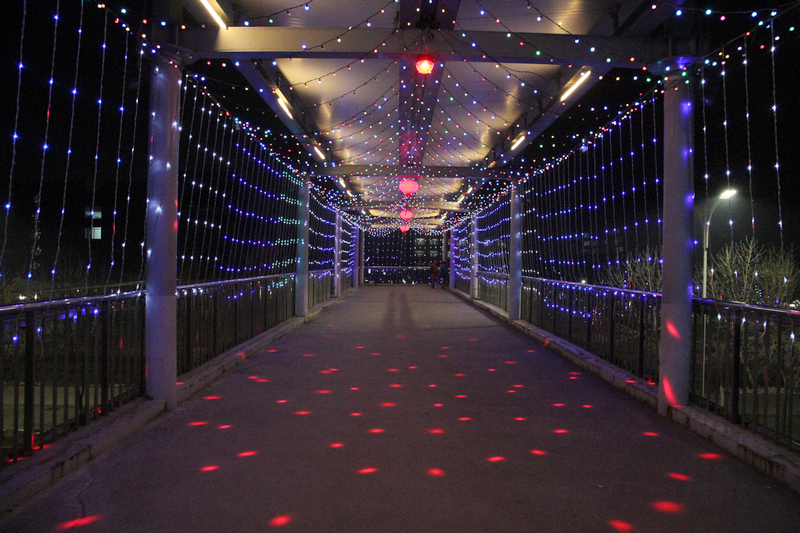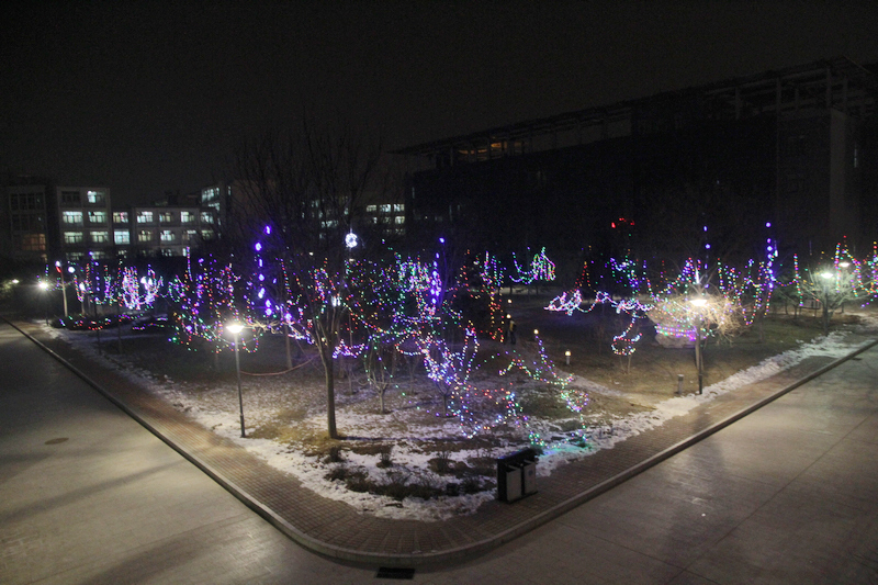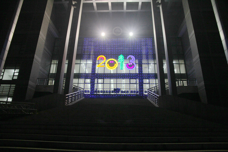 新年將至,校園里到處洋溢著歡樂喜慶的節(jié)日氣氛。樹上閃爍著五顏六色的彩燈,天橋上裝扮的彩燈和燈籠顯得格外喜慶、溫馨,“歡度新年”的紅色橫幅在學(xué)生活動(dòng)中心門前鋪開,文體館前懸掛著的“2013”彩燈字樣絢麗奪目。