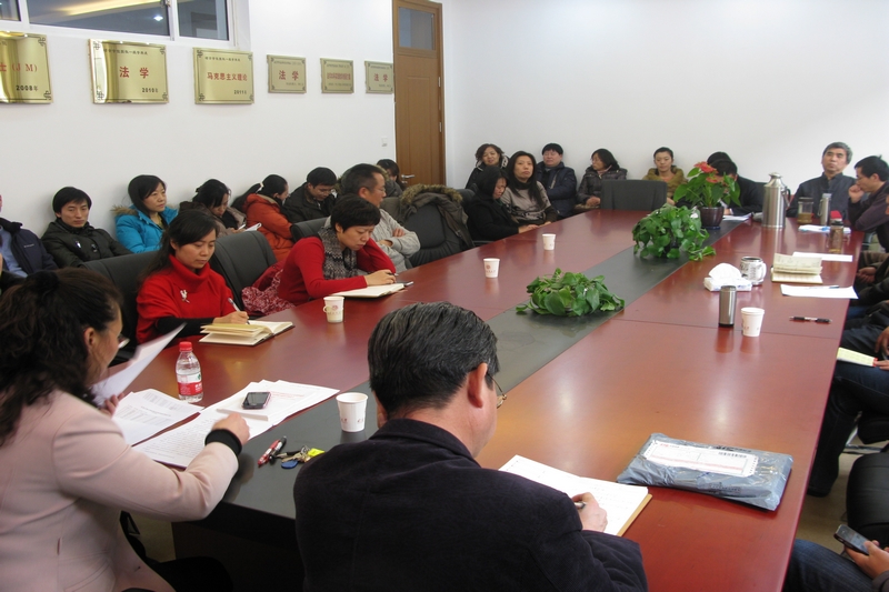 張秀芬院長主持會議并講話,她回顧了2012年學院的各項工作和發展情況。2012年是法學院/馬克思主義學院實現跨越式發展的一年,學院工作整體上了一個新臺階。一是本科教學工作平穩運行,教學改革深入推進。初步構建了專業教育、通識教育、全人素質教育三位一體的法學本科教學體系,繼續深化完善思想政治理論課“3+1”實踐教學模式,實踐教學效果明顯。學生獲得第三屆北京市大學生模擬法庭競賽二等獎;三位教師分獲本科教學優秀一等獎、二等獎;三項成果分獲校教育教學成果一等獎和二等獎;教師指導的兩篇社會實踐論文分獲首都大學生思想政治理論課暑期社會實踐優秀論文評比一等獎、二等獎。二是學科建設及研究生教育有了新進展。成功籌建了學校商法研究中心,增設刑事訴訟法二級學科點獲得批準,積極支持和參與北京市2011協同創新中心的建設工作。組織召開祝賀徐學鹿教授八十壽辰暨 “商法的軌跡——從傳統到現代”主題研討會和“馬克思主義與當代思潮學術研討會暨研究生培養工作研討會”,積極推動學科建設和研究生培養工作。三是科研工作成績斐然。2012年,學院共獲批國家社科基金項目5項,省部級項目8項,一般縱向項目4項,橫向課題10項。一人獲校級優秀科研成果一等獎,一人三等獎,學院獲得校科研管理先進單位。組織召開學院青年教師科研規劃座談會,加強青年教師的科研能力培養。四是黨建工作、學生工作和工會工作順利開展。認真開展“創先爭優”、“基層組織建設年”、學習十八大報告等工作。積極開展積極分子的培養教育、黨員的再教育工作。認真做好畢業生就業工作,學院被評為學校就業指導優秀獎。開展為期一個月的“激勵學術創新,演繹文化魅力”研究生文化節,豐富校園文化生活。