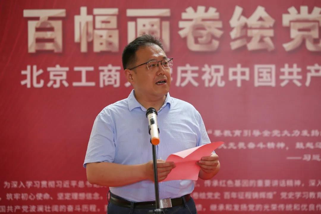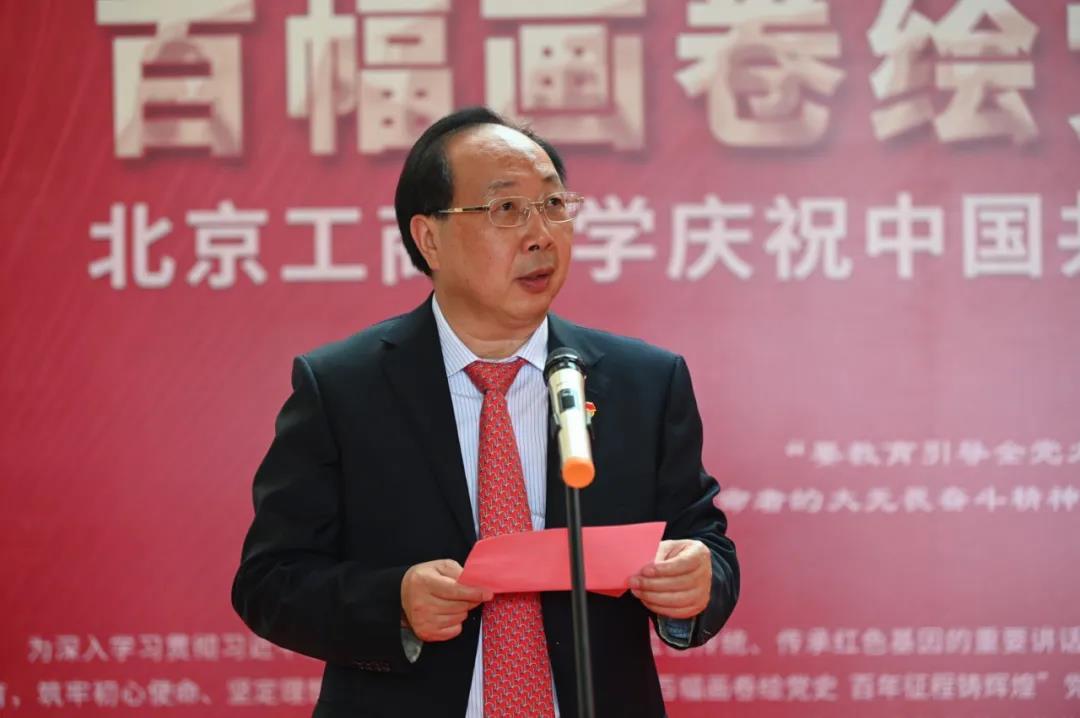黃先開代表學校黨委,向出席開展儀式的各位老師、同志們表示熱烈的歡迎,向為此次主題展覽成功舉辦付出辛勤努力的相關單位和精心創作作品的師生們表示衷心的感謝!他指出,為深入學習貫徹習近平總書記關于學習黨史,發揚紅色傳統、傳承紅色基因的重要講話精神,深入開展黨史學習教育,筑牢初心使命、堅定理想信念,學校舉辦“百幅畫卷繪黨史 百年征程鑄輝煌”黨史學習教育主題展覽。此次主題展覽是學校慶祝建黨百年的重要內容之一,是學校黨史學習教育的生動教材。北工商師生發揮專業所長積極踴躍創作,將藝術表達融入黨史學習教育,將課程思政與黨史學習教育緊密結合,進行了一次黨史學習教育的生動實踐。