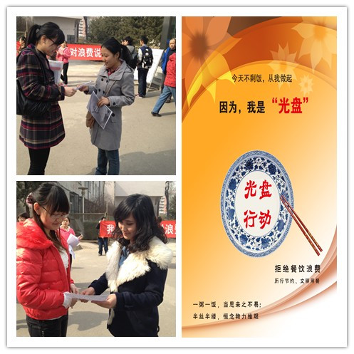 3月5日,食品學院團總支在阜成路校區東區食堂舉辦“學雷鋒 愛環保——今天不剩飯從我做起”活動,號召大家勤儉節約。無論是精心設計的主題為“光盤行動拒絕舌尖上的浪費”的海報,還是在食堂門口向全校師生分發的號召 “光盤行動”的宣傳單,都在溫馨地提醒大家拒絕浪費,形成人人節約糧食的良好校園風氣。此外還號召大家發揚節約糧食的優良作風,從我做起,天天不剩飯。