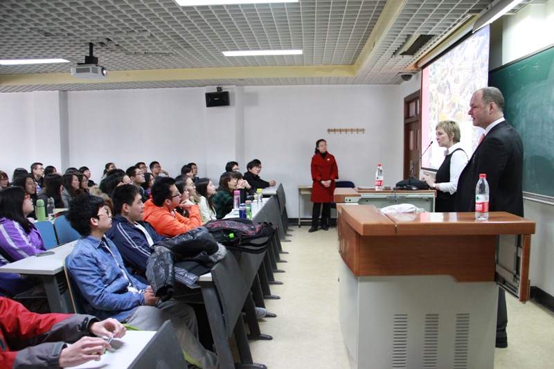 會(huì)見之前,代表團(tuán)到我校良鄉(xiāng)校區(qū)為我校學(xué)生進(jìn)行了合作項(xiàng)目的介紹。會(huì)場(chǎng)座無虛席,同學(xué)們認(rèn)真聽取項(xiàng)目介紹并踴躍提問?,F(xiàn)場(chǎng)的熱烈氣氛顯示出我校學(xué)生對(duì)出國留學(xué)的極大熱情以及學(xué)生們對(duì)我校與牛津大學(xué)赫特福德學(xué)院合作項(xiàng)目的高度關(guān)注。