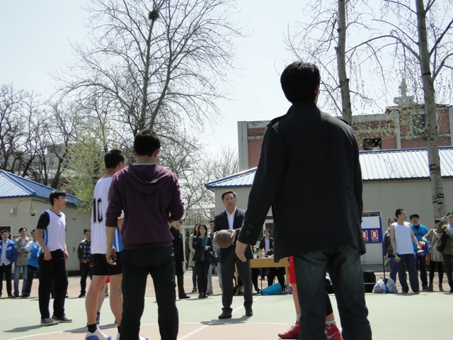 4月16日中午,2013研究生“龍躍杯”籃球賽在阜成路校區開幕,謝志華副校長親臨現場致開幕辭,并為首場比賽開球。