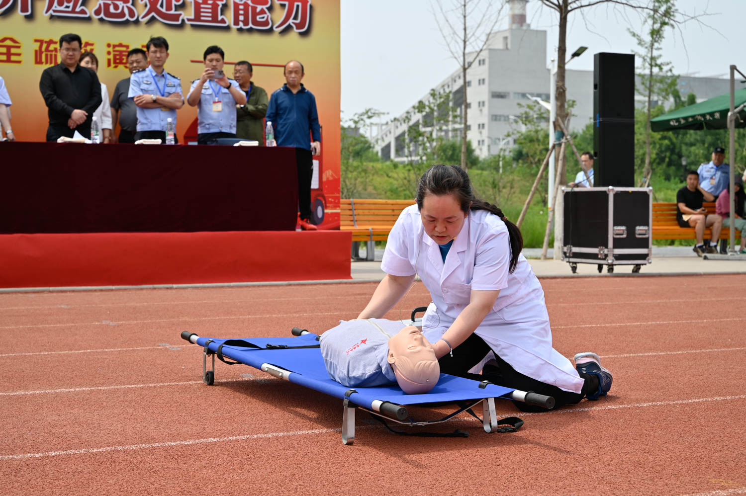 演習結束后,大學城消防救援站官兵展示了云梯車高空救援被困人員全過程,校醫院醫護人員演示了對昏迷人員現場實施急救的方法和流程。