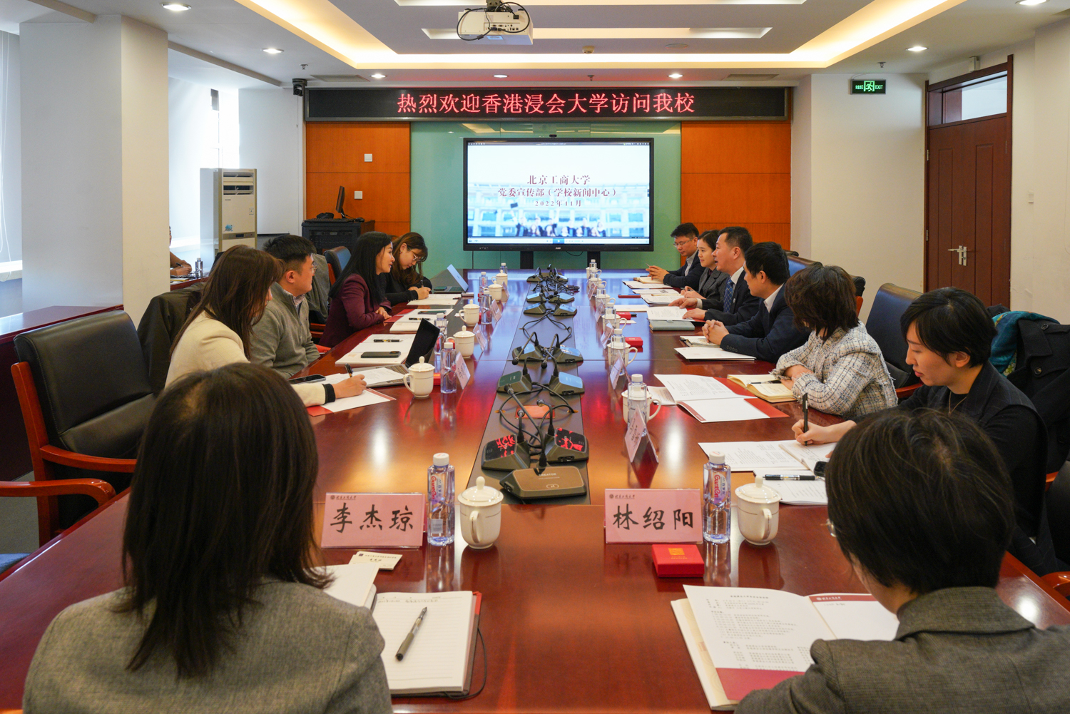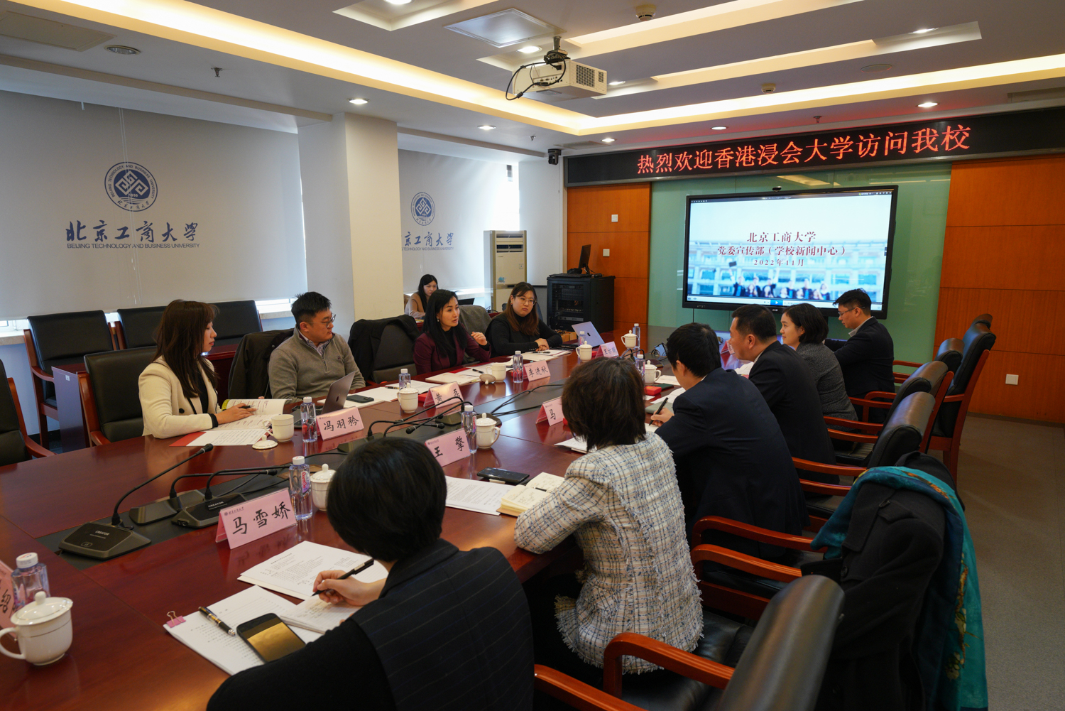 我校港澳臺辦公室主任賀冬萌介紹了我校相關學科的優勢和合作潛力,希望雙方在學生雙向交流、科研交流合作、重點實驗室建設、京港學術論壇等方面開展相關合作,促進雙方的交流。傳媒與設計學院院長王擎就學院的學科建設、特色專業、科學研究等方面進行了介紹,并就下一步與浸會大學傳理學院的合作提出了建議。人事處副處長錄馳沖圍繞我校在引進高層次人才方面的相關情況提出了相關的合作建議。
