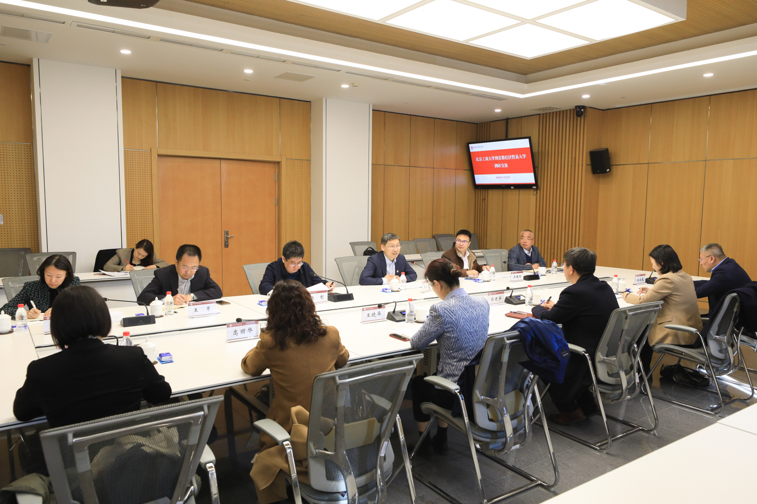 學校黨政辦公室主任王曉華,黨委研究生工作部部長郭新愿,人事處處長高麗華,科學研究院人文社科處處長孫永波,黨政辦公室副主任張揚陪同調研。首都經濟貿易大學黨委常委、發展規劃處處長、學科建設辦公室主任、國際經濟管理學院院長李鯤鵬,黨政辦公室主任張彤,科研處處長范合君,黨委研究生工作部部長、研究生院院長王軍,黨委教師工作部部長、人事處處長商筱輝參加座談。