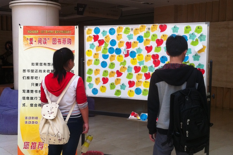 “誠薦一本書,心喚知己人”圖書推薦活動,則充分滿足廣大師生對館藏文獻資源的個性化信息需求,有效拉近了圖書館與讀者間的距離?;顒又?,同學們只需在貼紙上寫出書名、作者、出版社等信息,便可為自己或其他同學推薦一本好書。目前,已有865名讀者有效填寫了薦書單,圖書館將及時把購買信息反饋給薦書讀者。