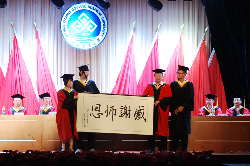 面對即將邁入社會的畢業生們,黃志剛院長勉勵大家要終生學習,追求真理。他寄語畢業生:腳踏實地,努力汲取知識才是立足社會的資本;要愛崗敬業,自強不息,樹立遠大的理想才是擁抱美好未來的根本;要報效祖國,熱愛母校,永遠記住北京工商大學是莘莘學子們的心靈港灣。優秀教師孟春玲則殷切希望畢業生們能夠腳踏實地、仰望星空,以開放的胸襟和旺盛的進取心擁抱新一輪的挑戰,不斷前行、實踐,飛翔到新的高度。