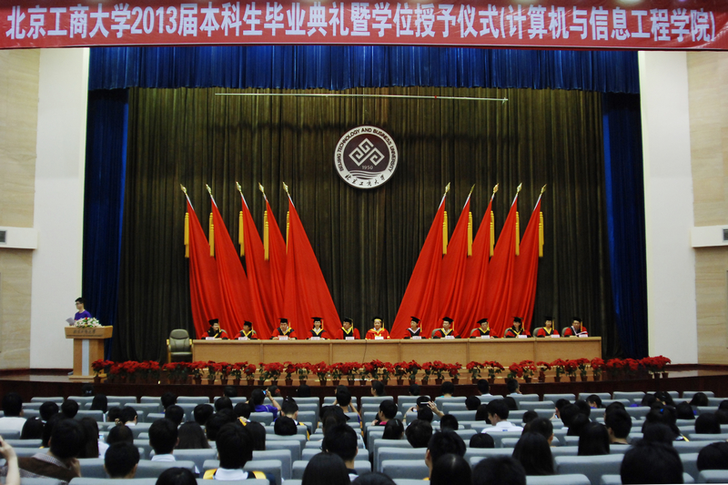 畢業典禮在莊嚴的國歌聲中開始。姜同強副院長宣讀了《北京工商大學關于2013屆本科生畢業暨學士學位授予的決定》,黨總支副書記張凱偉宣讀了表彰優秀畢業生的決定。計算機與信息工程學院2013屆本科生畢業生共462名順利完成學業,授予57名學生北京工商大學優秀畢業生稱號,26名學生北京市優秀畢業生榮譽稱號。