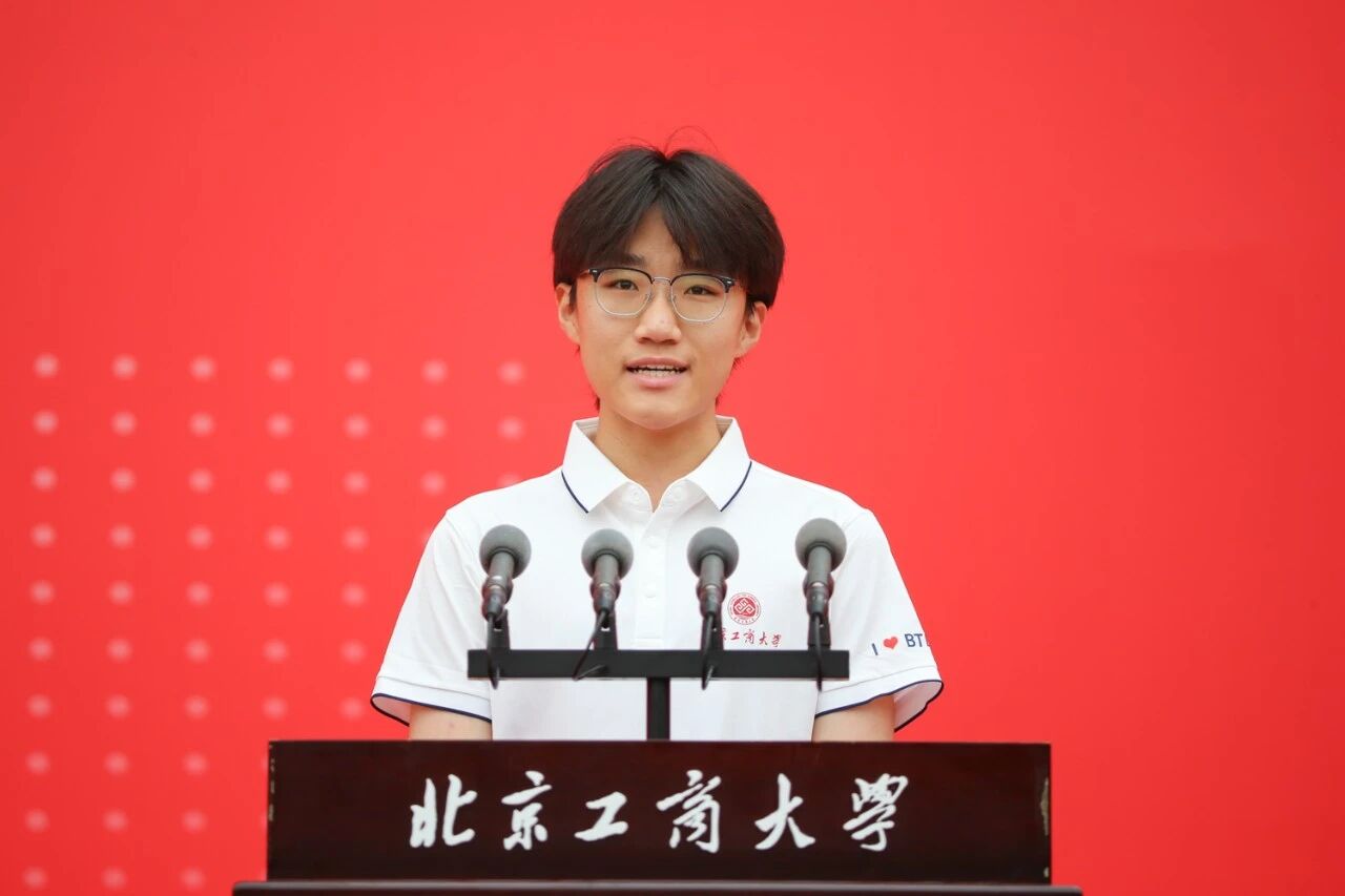 求真書院食品質量與安全實驗班耿凡稀作為新生代表發(fā)言。他以“奔赴真理、不負時代”為主題,回顧了自己被北工商“書院制”和“工商一體化”辦學特色所吸引的報考經歷,表達了對大學生活的憧憬與承諾。他表示,作為在國家強盛進程中成長起來的“05后”,既感自豪,更覺責任在肩。他倡議全體同學:要深植德善之根,恪守底線、勇?lián)熑危挥垒崆笳鏌岢溃試乐斉c熱愛叩響真理之門;用好首都資源,拓展視野、增長才干,努力成為具有家國情懷、創(chuàng)新能力和跨界思維的新時代青年。