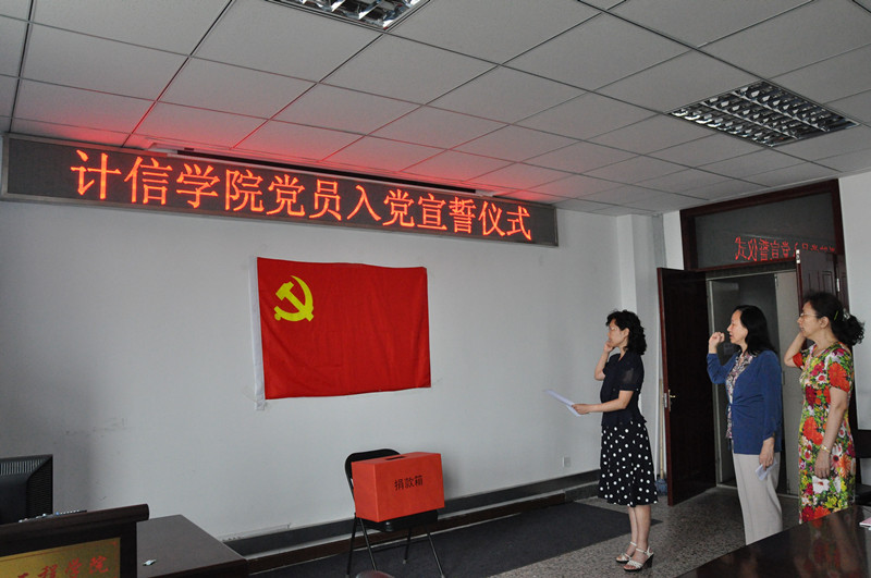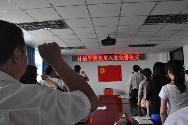 同日,蔡強院長主持舉行入黨宣誓儀式。今年六月計信學院共有3名教師預備黨員轉正,學院部分教工黨員參加了他們的入黨宣誓儀式。老黨員與新黨員一起宣誓,重溫入黨誓詞,共同回憶黨走過的92載崢嶸歲月。熟悉的誓詞引發了教師們的思考。薛紅教授作為新黨員代表發言,她說:“成為了一名黨員真的很開心,今后將更加積極地工作,雖然年紀大了,但仍然會以一個新黨員的身份嚴格要求自己,努力向大家學習。”老黨員張曉力老師表示:“我們在重溫誓詞時會問自己,有沒有真正地履行黨員義務,有沒有真正做到積極工作,這促使我們反思與進步。” 入黨積極分子青年教師祝曉斌表示:“今天的宣誓儀式很神圣,今后一定要向老黨員學習,積極上進,努力工作。” 黨總支書記陳誼對三位新黨員表示了祝賀,然后勉勵在場的全體黨員和積極分子:要繼續發揚黨的優良傳統,在學院的各項工作中發揮模范帶頭作用,發揮正能量,為學院的發展做貢獻。