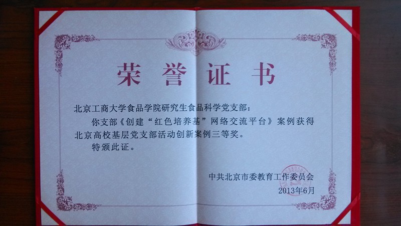 在日前召開(kāi)的北京高校紀(jì)念中國(guó)共產(chǎn)黨成立92周年座談會(huì)上,表彰了北京高校黨支部活動(dòng)創(chuàng)新案例,我校食品學(xué)院研究生食品科學(xué)黨支部《創(chuàng)建“紅色培養(yǎng)基”網(wǎng)絡(luò)交流平臺(tái)》案例獲北京高校基層黨支部活動(dòng)創(chuàng)新案例三等獎(jiǎng)。