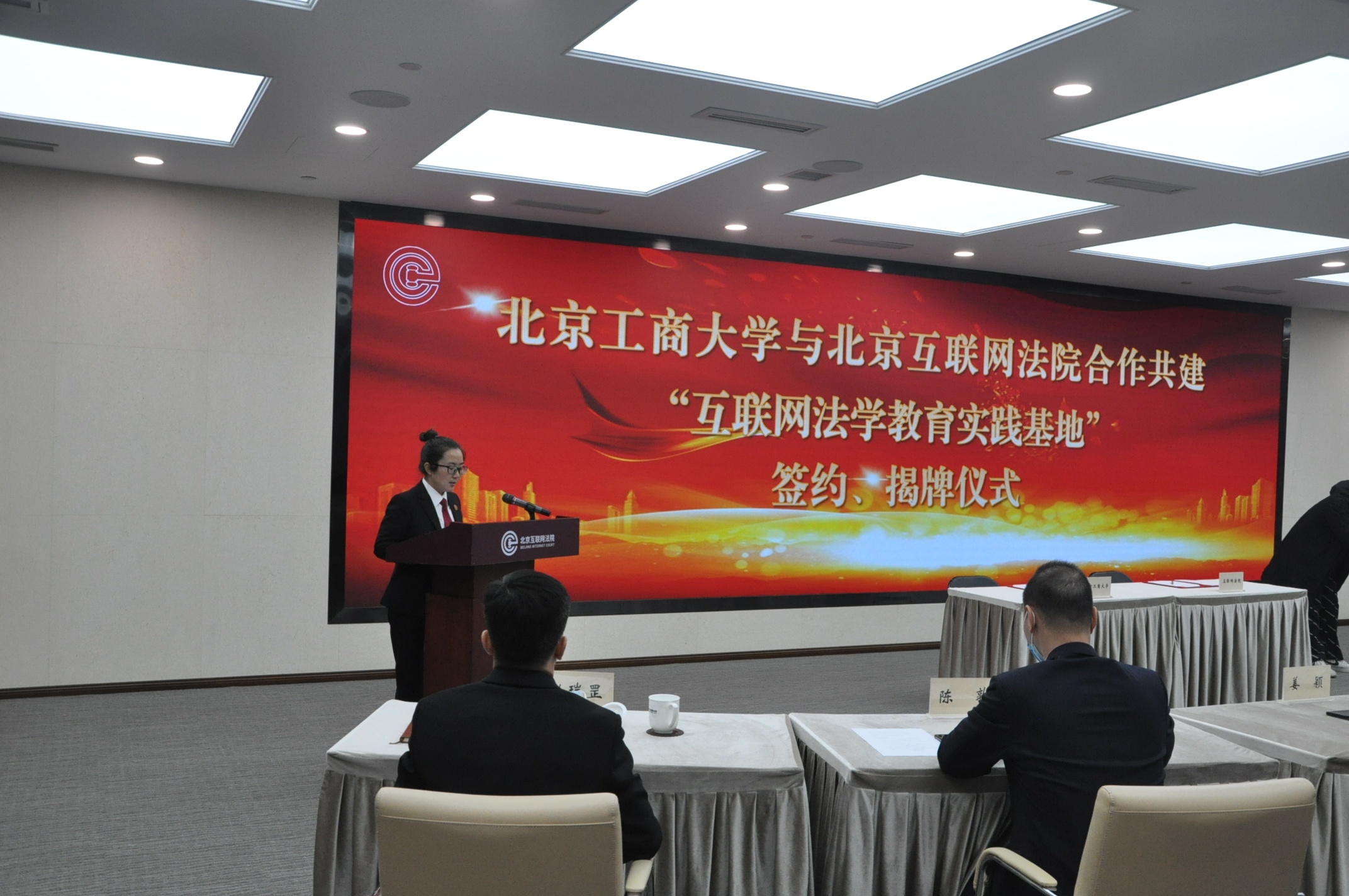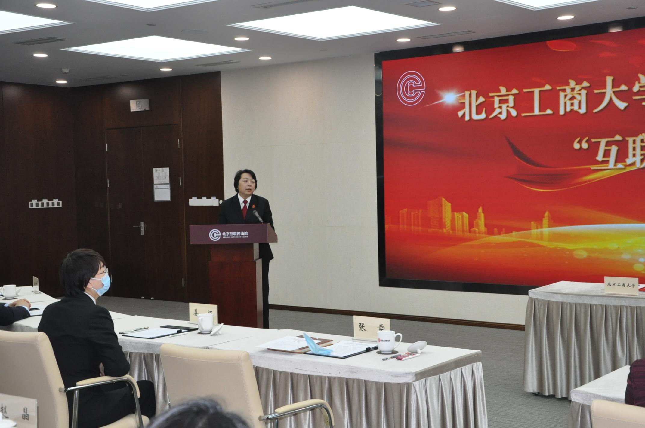 趙瑞罡代表法院對我校一行表示熱烈歡迎。我校2016屆校友、北京互聯(lián)網(wǎng)法院綜合審判一庭法官王紅霞發(fā)言,她回憶了在北京工商大學的七載求學歲月,表達了對母校及恩師的感激之情,分享了入職幾年來的工作體會,并對母校和北京互聯(lián)網(wǎng)法院之間的深層次合作交流充滿期待。