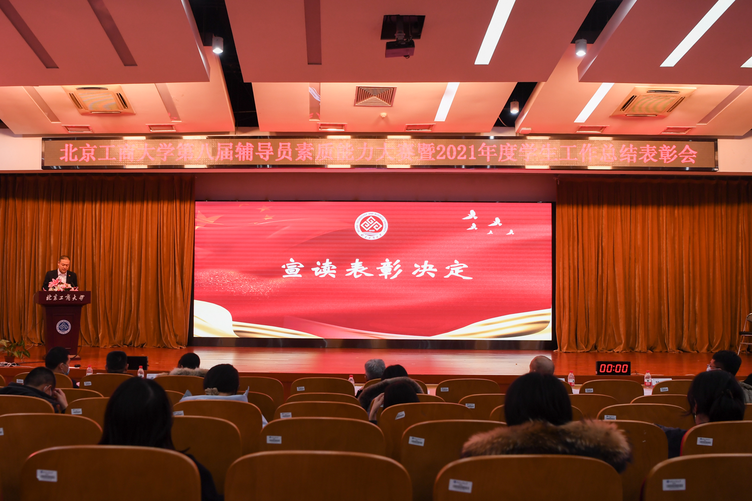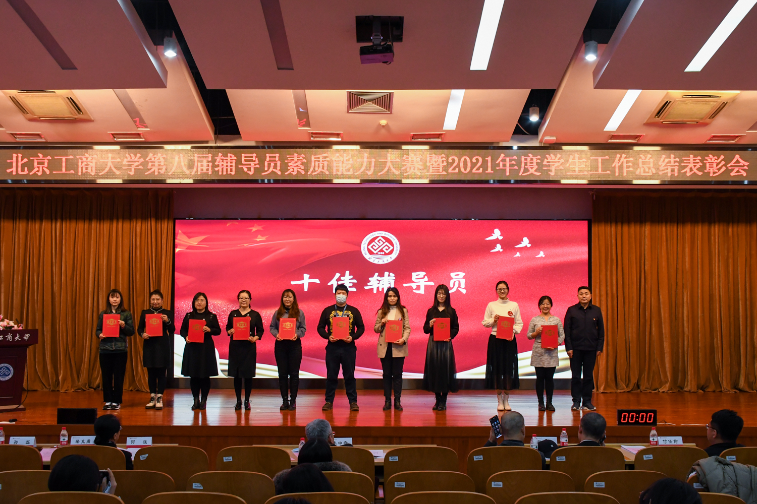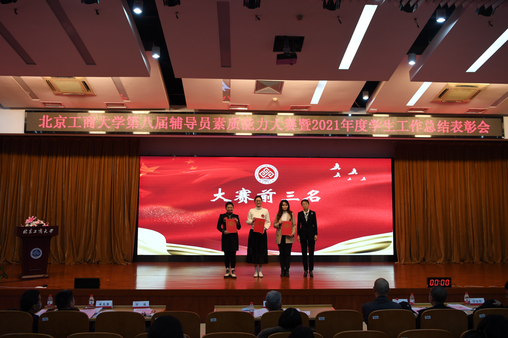 表彰大會環節,與會人員集中觀看2021年學生工作總結視頻。學生處處長呂良宣讀《關于表彰北京工商大學2021年度學生工作先進集體與先進個人的決定》,李中奇副書記、職能部門負責人現場為優秀輔導員、十佳輔導員、十佳班主任、第八屆素質能力大賽前三名及專項工作先進集體、學生工作先進單位頒發了獎項。