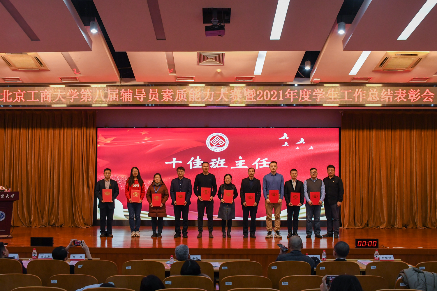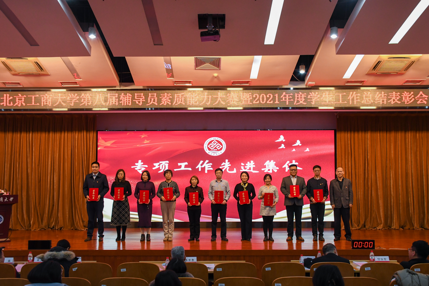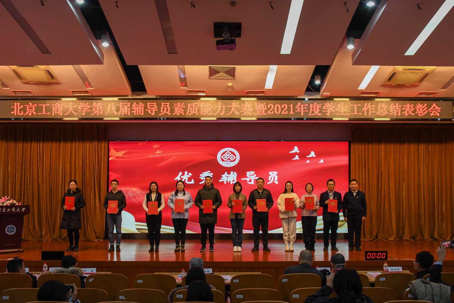 表彰大會環節,與會人員集中觀看2021年學生工作總結視頻。學生處處長呂良宣讀《關于表彰北京工商大學2021年度學生工作先進集體與先進個人的決定》,李中奇副書記、職能部門負責人現場為優秀輔導員、十佳輔導員、十佳班主任、第八屆素質能力大賽前三名及專項工作先進集體、學生工作先進單位頒發了獎項。