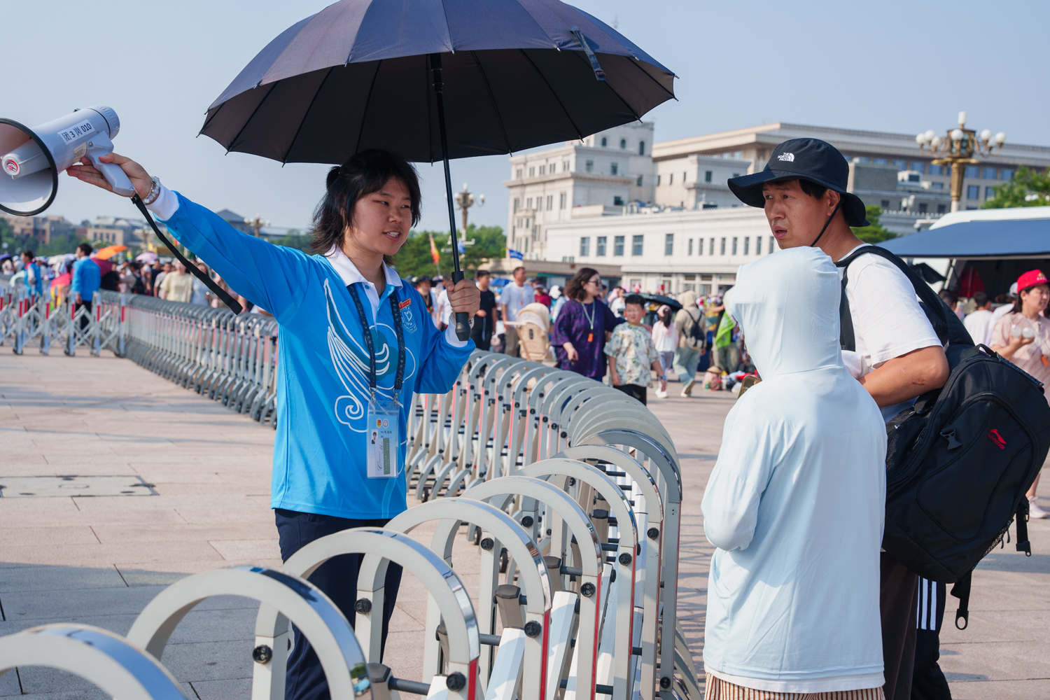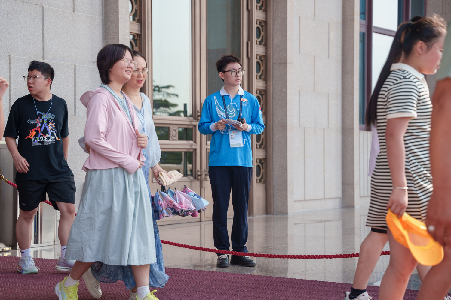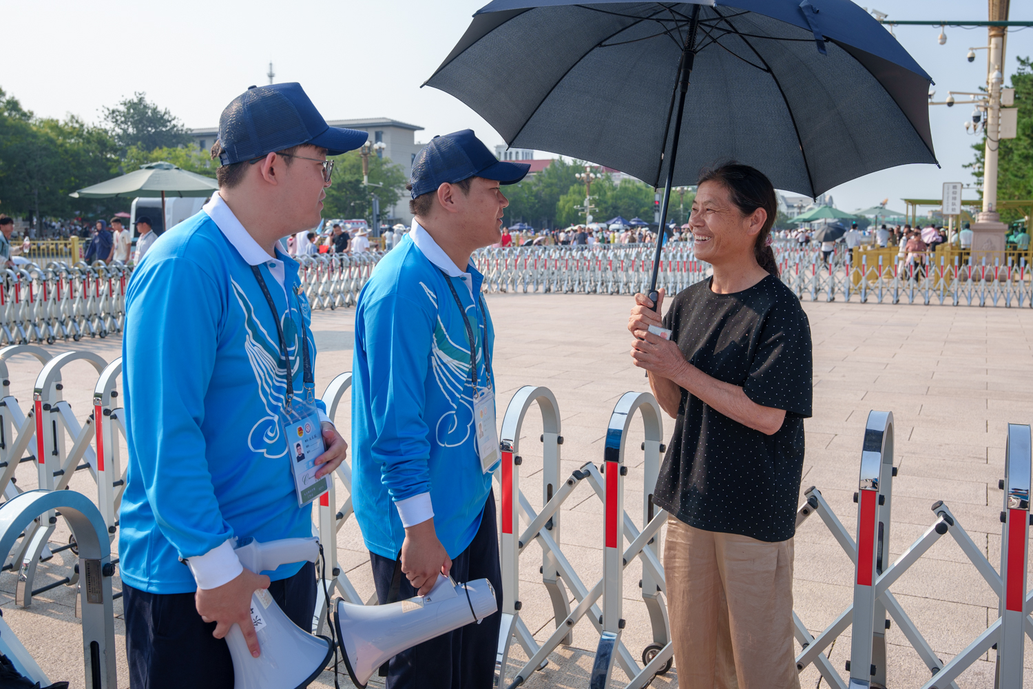 每日凌晨5點,志愿者們迎著旭日整裝集結,7點前準時奔赴扶老助殘、預約指導、解疑答惑、秩序維護、獻花引導等14個不同的服務崗位。在烈日炎炎的八月盛夏,室外高溫炙烤,志愿者們的衣服雖被汗水浸透,但他們在各自的崗位上始終如一,為來自五湖四海的瞻仰群眾提供暖心、細致、周到的服務:一絲不茍地維護現場秩序,認真細致地解答群眾疑問,悉心攙扶步履蹣跚的老人,全力協助殘障人士上下輪椅……成為天安門廣場上一道亮麗的風景線,也生動展現了新時代首都志愿者的良好風貌。