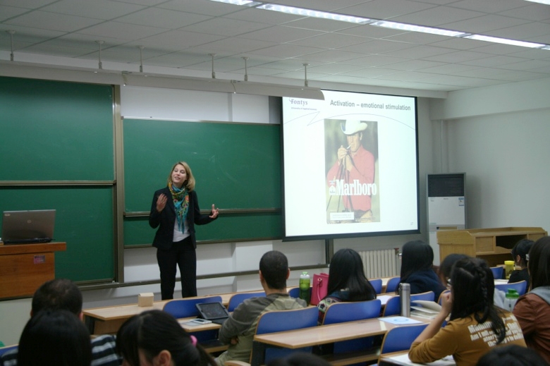 麥克女士分別在兩校區(qū)為商學(xué)院的本科生、研究生學(xué)生講授了《公共關(guān)系學(xué)》和《消費者行為學(xué)》等課程。麥克女士向?qū)W生介紹了消費者行為的定義、構(gòu)成、特性和影響因素,并指出,作為消費者,我們每天接觸的信息遠(yuǎn)超我們的處理能力,龐雜的信息使我們在接受信息時存在困難。她認(rèn)為,從市場營銷的角度來看,最重要的是要找到把信息有效傳遞給消費者的方法,將商業(yè)廣告與消費者情緒與認(rèn)知相結(jié)合,達(dá)到刺激消費者的目的。麥克女士同時還演示了在消費者刺激過程中,營銷人員如何使用視頻、圖片、互聯(lián)網(wǎng)等形式來影響消費者。