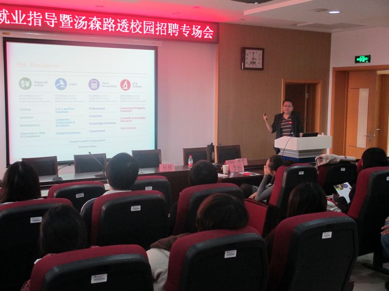 湯森路透集團人力資源經理曹蕾為同學們做企業及其產品Eikon的介紹,湯森路透集團是全球最大的專業信息服務提供商,為金融、法律、稅務與財會、科學技術、知識產權和媒體等領域的專業人員和決策者提供重要的信息,其中國研發及數據中心現擁有近1,200名員工,為全球超過50萬的專業人員提供金融領域的專業軟件,自成立以來持續吸收優秀人才。吳海龍為同學們具體說明職位要求,并且讓大家了解到企業文化和對員工發展的重視。