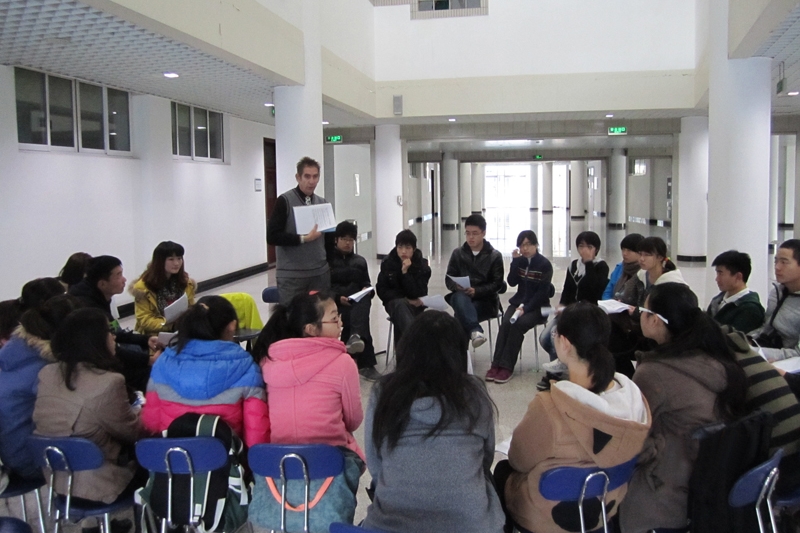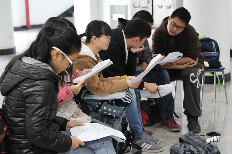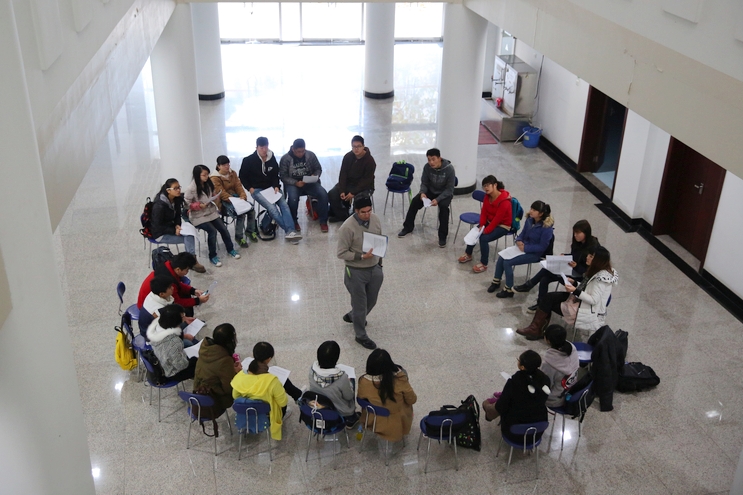 周一清晨7:15,距離上午第一節(jié)課還有1個多小時,文三樓一層的大廳里,來自各學(xué)院的幾十名學(xué)生,在外教Mervyn的帶領(lǐng)下圍坐成一圈,認真地大聲朗讀和排練著手中的英文劇本。Mervyn不時地糾正學(xué)生的發(fā)音或語調(diào),并指導(dǎo)學(xué)生說話時加入感情和語氣。每位學(xué)生都聚精會神地看著手中的劇本,在Mervyn細心的指導(dǎo)下,投入地扮演著自己的角色。劇本排練結(jié)束后,學(xué)生們湊上前圍坐在Mervyn旁邊,用英文向他提問,他耐心地回答著學(xué)生問題,并帶領(lǐng)學(xué)生一遍一遍地練習(xí)正確的發(fā)音。這是外國語學(xué)院澳大利亞籍外教Prince Mervyn James Edwards老師為本科生舉辦的英語角,也是外國語學(xué)院公共英語延續(xù)教學(xué)活動的一種形式。