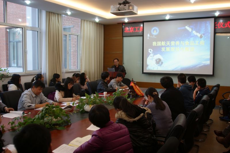 受聘儀式后,陳斌研究員為與會師生作了題為“我國航天營養與食品工程發展現狀與展望”的學術報告。他就航天食品的研究、國外航天食品與營養發展及我國航天食品與營養工程的發展情況與未來發展趨勢等方面做了生動精彩的報告。報告中關于中式食品的航天化研究,中國特色的航天營養保障體系等內容吸引了在場的每一個人,原定一個半小時的學術講座持續了兩個多小時。最后報告在全場師生熱烈的掌聲中結束。