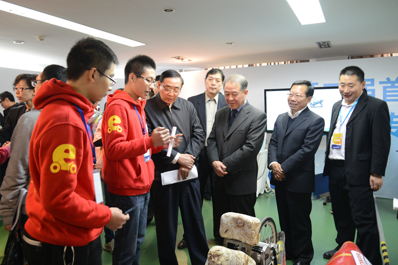 開幕儀式結束后,參會嘉賓觀看了科技創作品與專利成果展覽,并圍繞產品成本、創新點、實用性等和同學們親切交流。在我校展臺,周立軍副主席深入了解了我校“摳門狼”節能車隊的產品,希望學生們繼續鉆研核心技術,從使用對象等多方面進行考慮,使技術更加精尖,從而更加專業化。