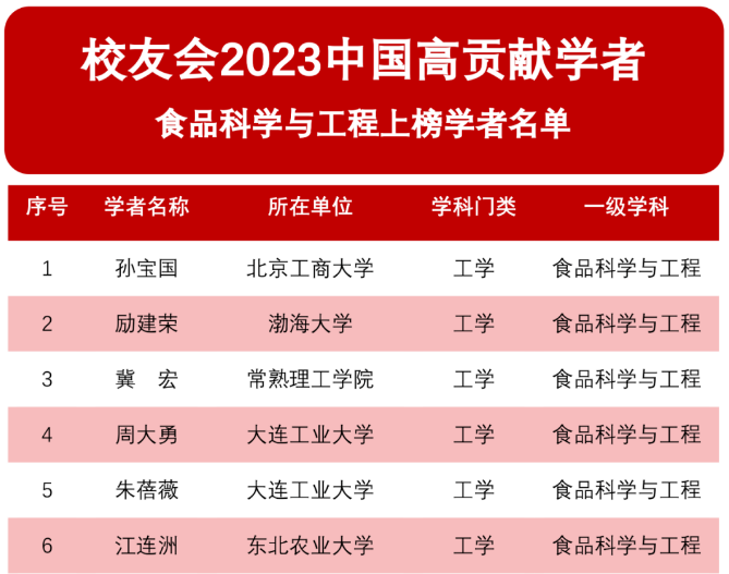 6月8日,全國第三方大學評價機構艾瑞深校友會網最新發布校友會2023中國高貢獻學者完整名單,全國高校共有6917名杰出學者入選,分布在524個高校,涵蓋12個學科門類的98個一級學科。《食品科學與工程》一級學科共計46人入選榜單,中國工程院院士、我校校長孫寶國入選!