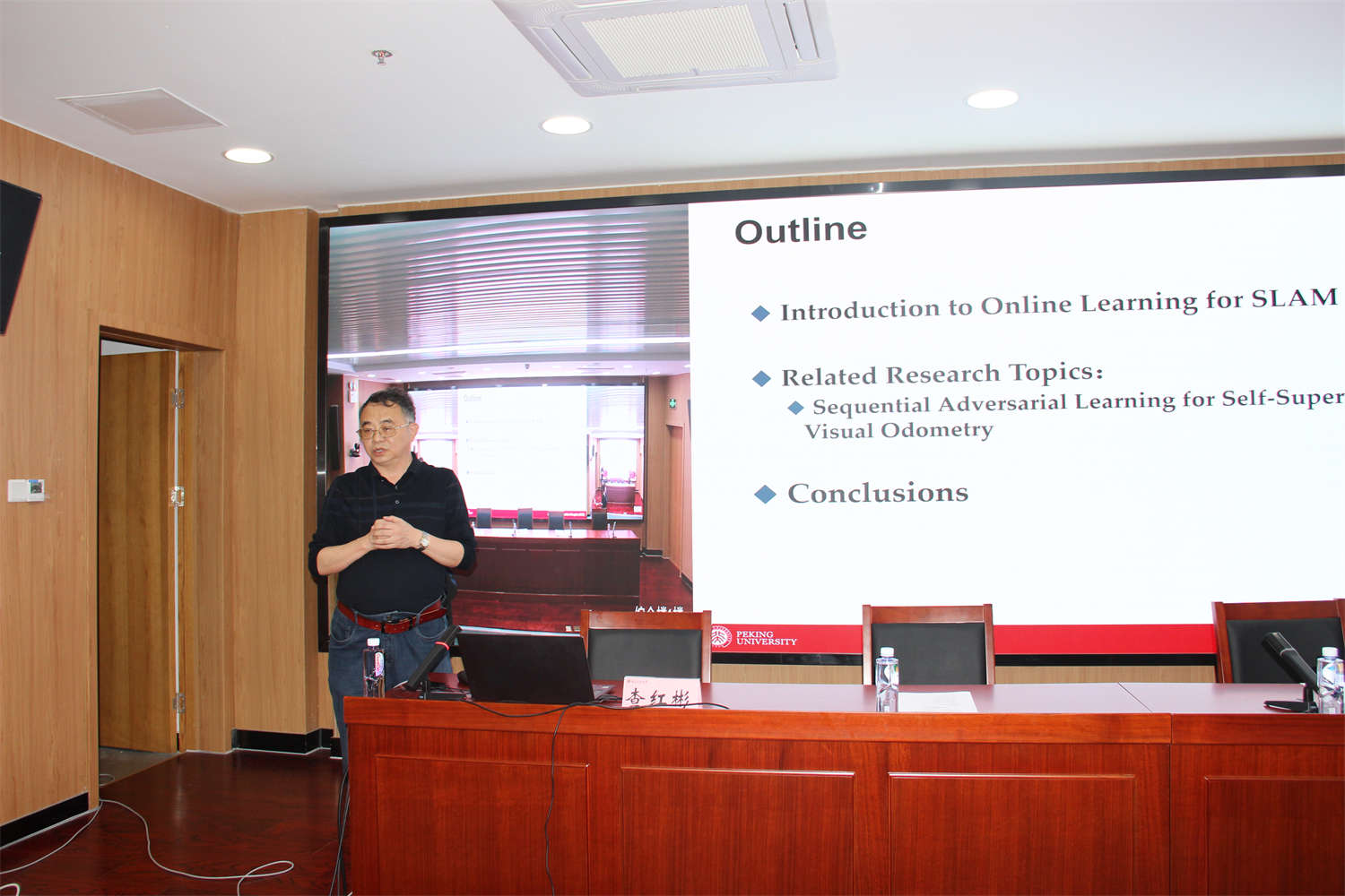 會上,查紅彬教授做了題為《視覺SLAM:在線學習的途徑》的報告。他以無人駕駛技術的發展為背景,介紹了SLAM技術——即時定位與地圖構建技術的基礎概念。針對傳統的多傳感器融合與多視點計算具有計算量大、優化困難等缺陷,提出了融合在線學習的SLAM。在線學習是實現強化視覺系統的環境自適應性的途徑,可將“預測”能力有效引入到SLAM流程之前,從而將整個流程作為“構造預測器”,以提高后續處理能力。隨后查教授介紹了視覺SLAM方向的最新方法包括面向自監督視覺里程計的序列對抗學習方法、具有在線自適應能力的自監督SLAM學習等。
