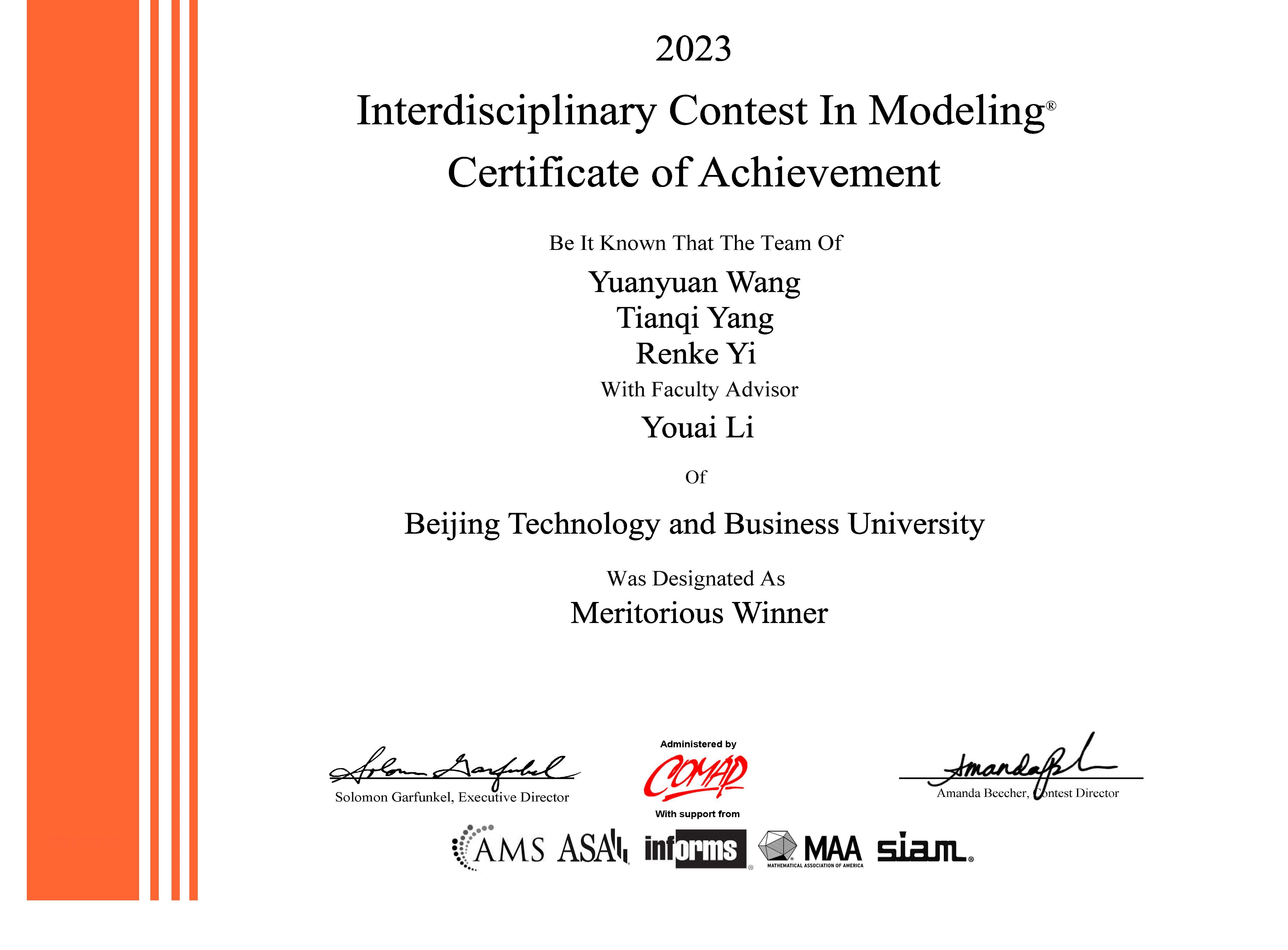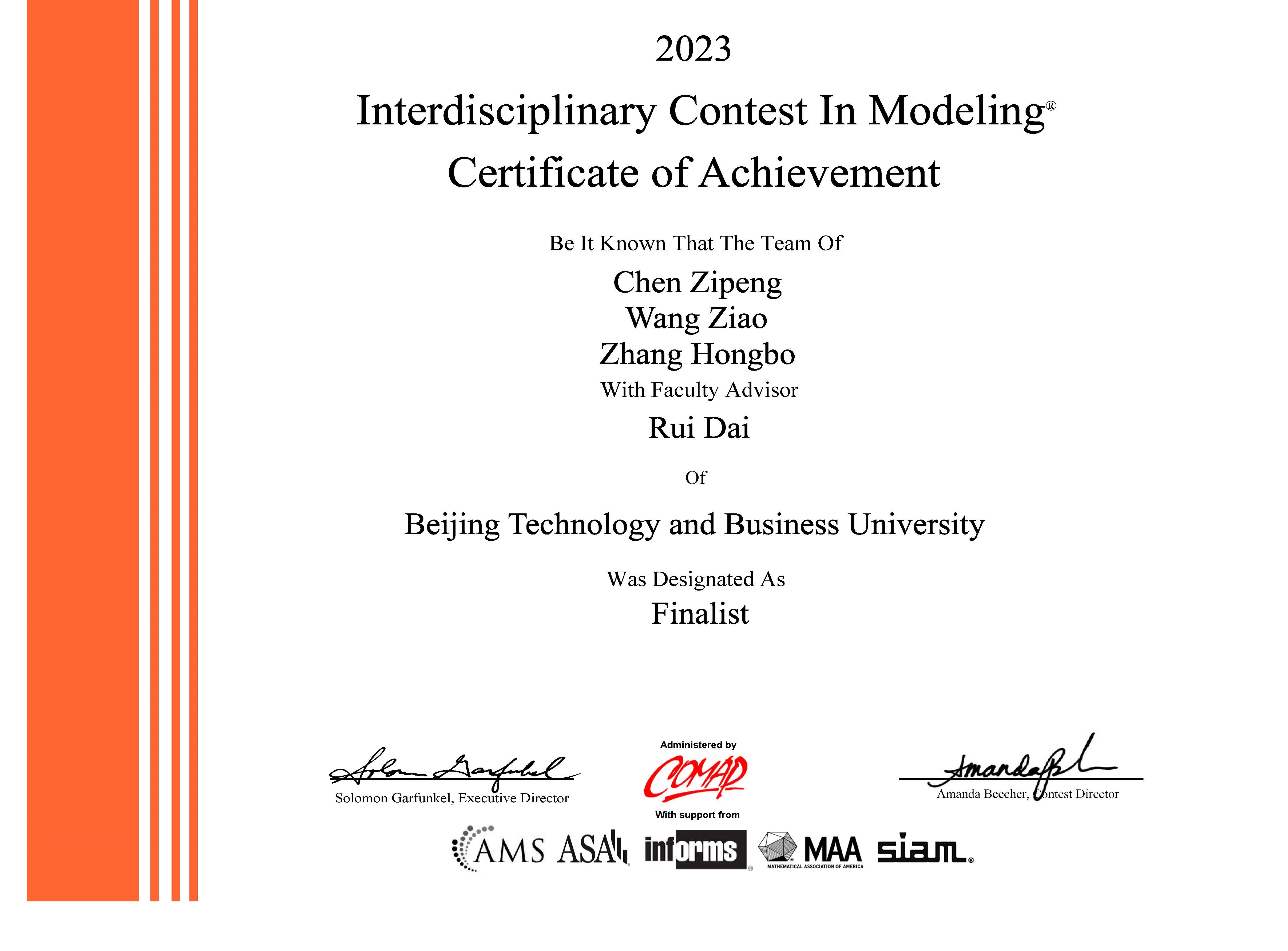 近日,2023年第39屆美國大學(xué)生數(shù)學(xué)建模競賽結(jié)果公布,我校20級注會專業(yè)(全英)陳子芃、19級注會專業(yè)王子翱、信息管理與信息系統(tǒng)專業(yè)張宏博獲美國大學(xué)生數(shù)學(xué)建模競賽Finalist獎(jiǎng)(Finalist 1項(xiàng)),取得我校本科生參與該項(xiàng)賽事的歷史性突破,為我校學(xué)子首次斬獲F獎(jiǎng)。此外,我校學(xué)子還獲一等獎(jiǎng)(Meritorious Winner)1項(xiàng),二等獎(jiǎng)(Honorable Mention)9項(xiàng)。