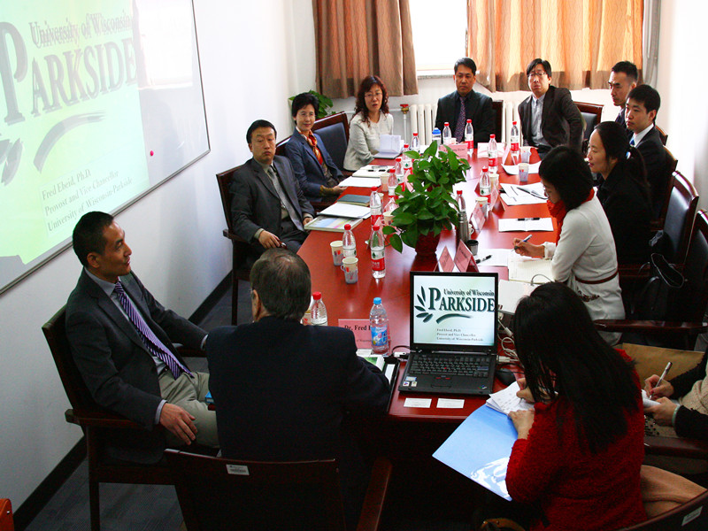 在外國語學院,美國威斯康辛大學帕克賽德分校弗雷德•艾比德(Fred Ebeid)與外國語學院負責人、教授和相關專業教師進行座談,就兩校英語專業本科生的聯合培養項目、研究生交換項目、外語教師的互派交流等方面的內容交換了意見,雙方希望能夠盡快落實各類項目的具體方案,開展不同種類的交流活動。