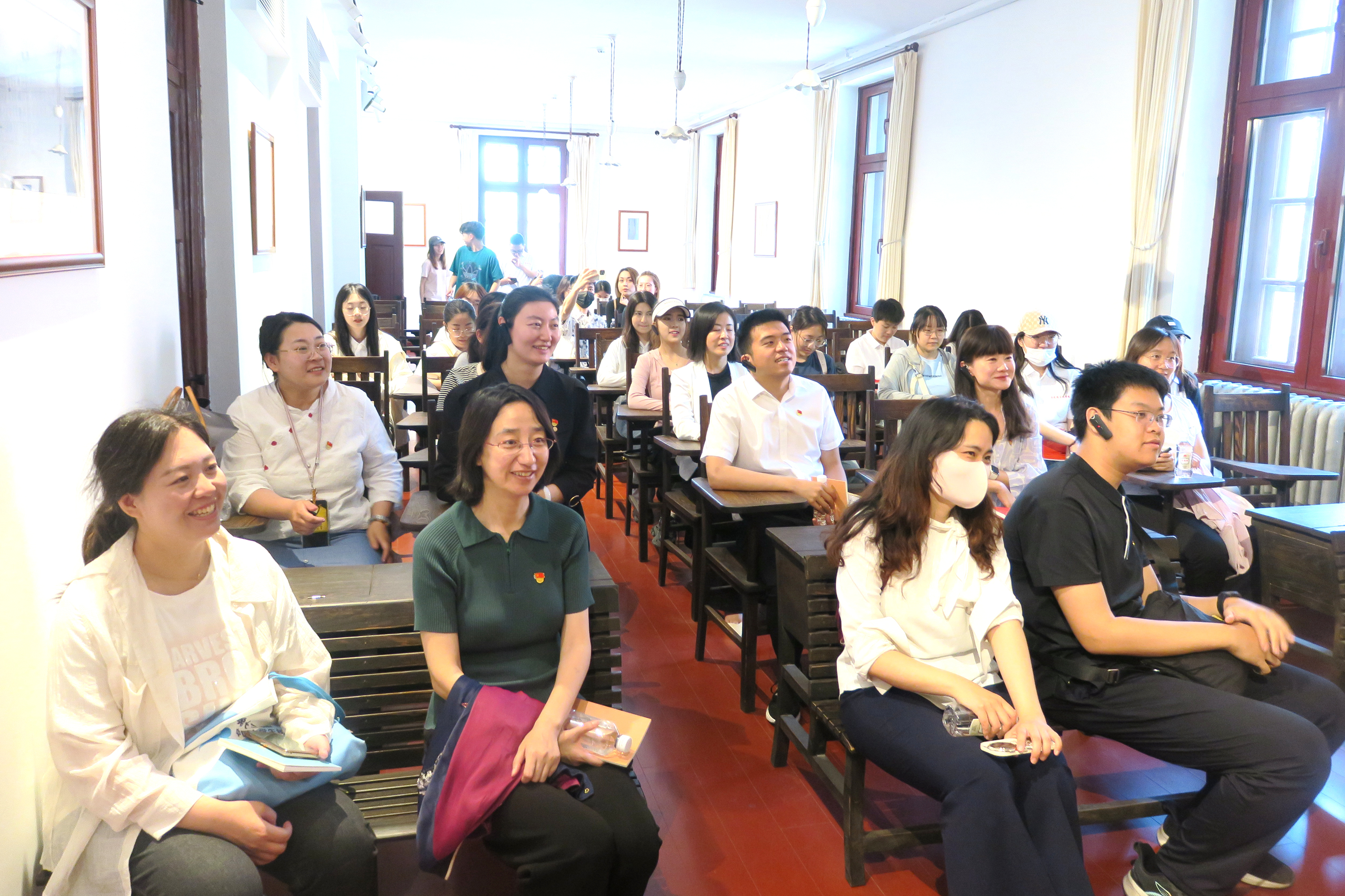 楊家毅館長站在當年李大釗授課的講臺前娓娓道來,為師生們分享青年毛澤東在北大紅樓、北大二院、楊昌濟故居、三眼井胡同、陶然亭慈悲庵、長辛店等紅色舊址開展革命活動的經歷。師生一行坐在毛澤東、鄧中夏等先驅者們曾經學習研討的座位上,仿佛穿越時空,開啟了一場穿越時空的對話。